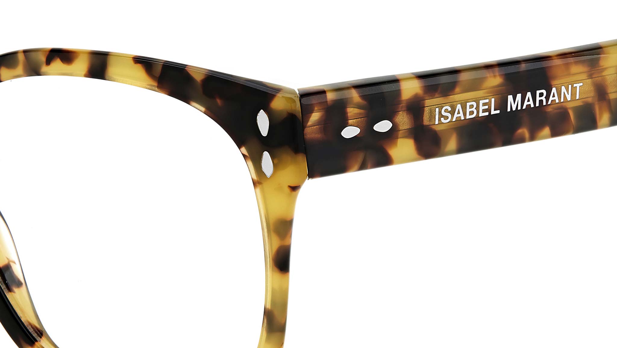 La collezione eyewear The New di Isabel Marant fa uno statement audace con una selezione di leggere montature in acetato declinate in tonalità trendy e sofisticate. Tributo all’iconico dettaglio Leaf del brand, ogni occhiale presenta terminali a forma di foglia e rivetti Silver Leaf sul frontale e sulle aste completate dall’anima in metallo e dalle cerniere con il logo laserato. Queste montature da vista dalla silhouette rettangolare sono realizzate in acetato e siglate dal logo Isabel Marant sull’asta sinistra.