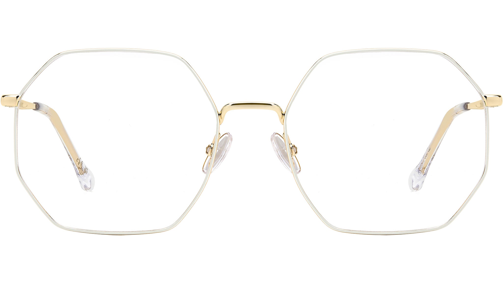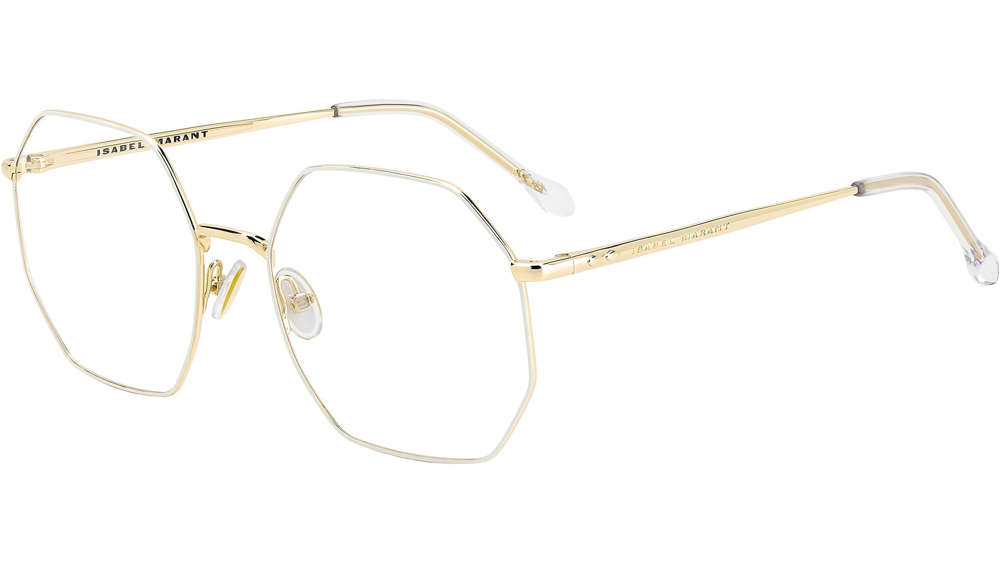 Occhiali da vista Isabel Marant modello IM 0179 codice colore 3VV Gold Ivory con lenti demo. Delicata, moderna e dall'essenza femminile: scopri la collezione eyewear Wild Metal di Isabel Marant. Queste montature leggere in metallo presentano una silhouette geometrica dall'appeal minimalista, completate da iconici terminali sagomati e bordi a rilievo sull'asta che celebrano uno dei codici stilistici distintivi del brand: il motivo a foglia. I comodi naselli regolabili e il logo inciso al laser sull'esterno dell'asta aggiungono un tocco esclusivo a questo occhiale.