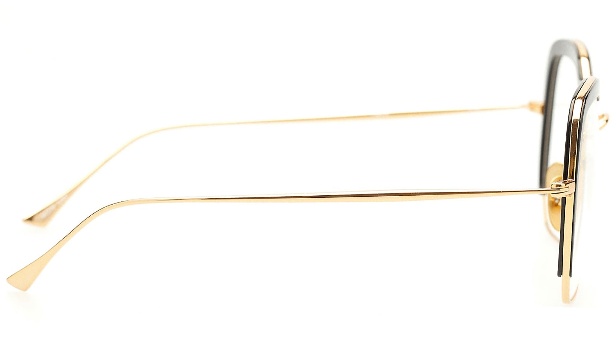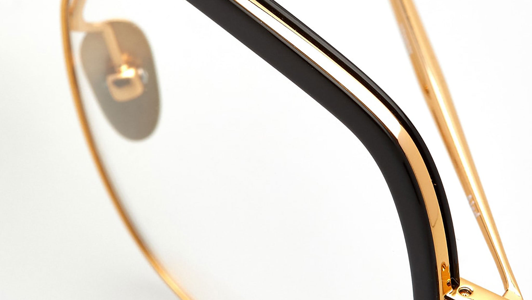 Gli occhiali da vista Aird 1 in titanio e acetato di Kaleos sono una lussuosa combinazione di moda e innovazione. Le montature nere monocromatiche opache sono accentuate da una profilatura e un ponte in titanio color oro, con naselli e astine regolabili per una perfetta vestibilità. Realizzati a mano con materiali di alta qualità e costruzioni complesse, questi occhiali unici combinano gusto contemporaneo e funzionalità.