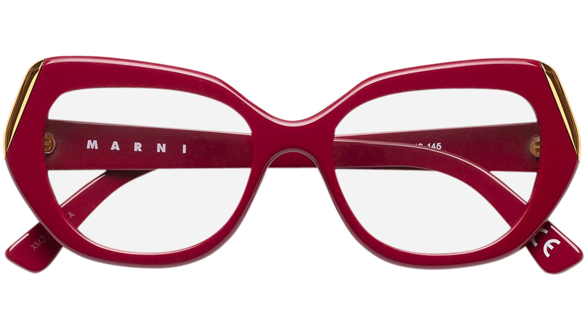 Designed exclusively for Marni, Antelope Canyon is an oversized acetate frame characterised by sculpted rims. The model’s rounded design features a lower nose bridge with a v-shaped brow-line. Metal caps on the sides give this frame a distinctively elegant character. This version comes in bold red acetate with gold metalwork. Sizes: R Lens Width: 54 mm. Frame Front: Frame Side: 145 mm. Product Code Size R: XM3