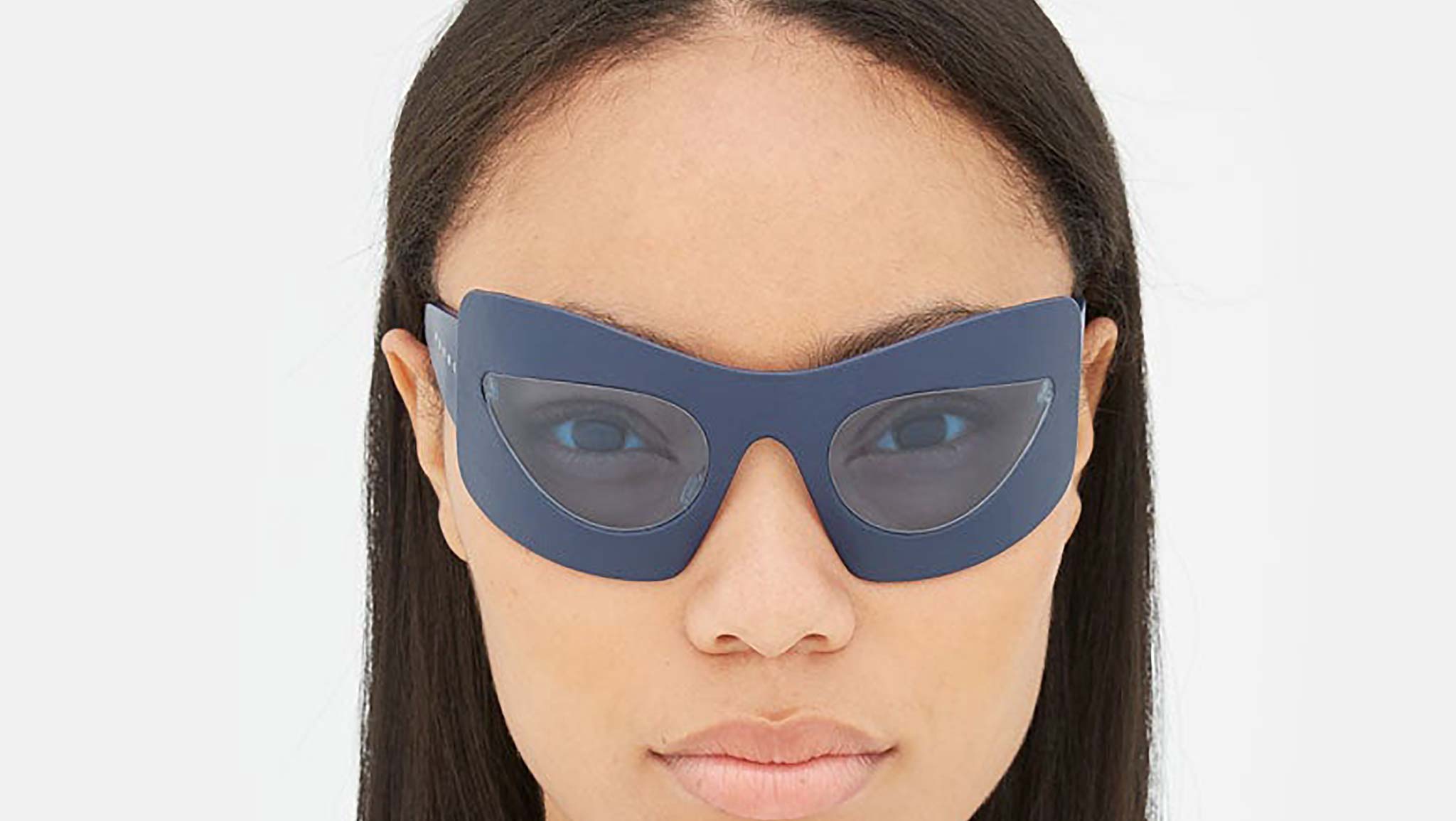 Designed exclusively for Marni, this genderless design underlines RSF’s ultra lightweight and flexible Tuttolente technology. Working with unique wrap-around shields which delicately embrace your face, the over-sized silhouette reveals only the essential and functional structure for a one of a kind design. The frontal frame as well as temples are entirely made from the highest quality of nylon by Carl Zeiss, which have been meticulously hand-covered by artisans with real leather. Leaving only the oval lens shapes clear for an optimal vision. This version of the Karakum Desert is available in a soft navy blue leather and playful blue lenses. Sizes: R Lens Width: 55 mm. Frame Front: Frame Side: 115 mm. Product Code Size R: 9P6