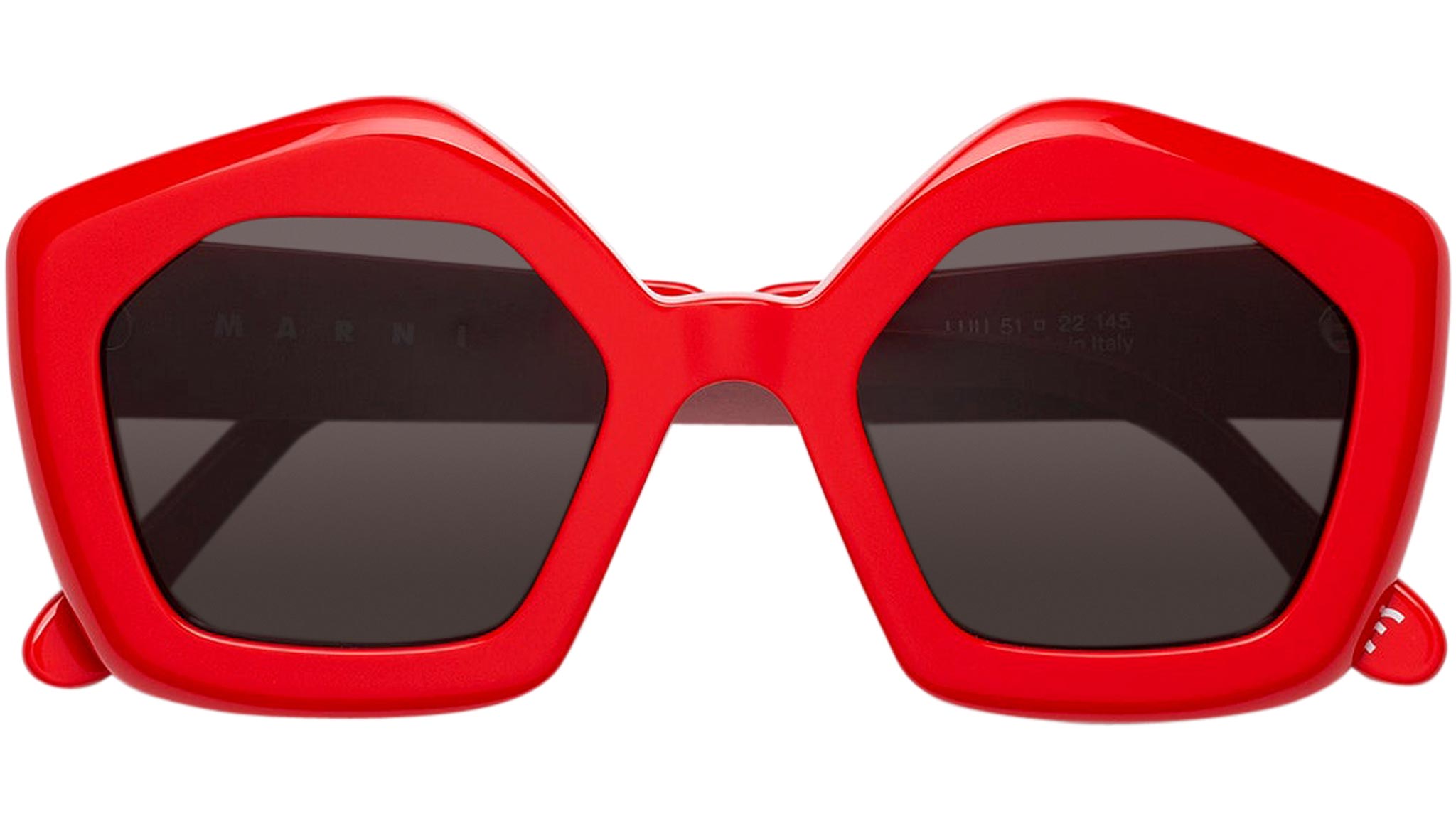 Designed exclusively for Marni, Laughing Waters is a chunky acetate silhouette characterized by oversized lenses and sculpted rims. The model’s iconic pentagonal lens shape is a reinterpretation of Marni’s heritage silhouette. This version comes with black lenses and a deep red acetate with Marni branding on the temples. Sizes: R Lens Width: 51 mm. Frame Front: Frame Side: 145 mm. Product Code Size R: LUU