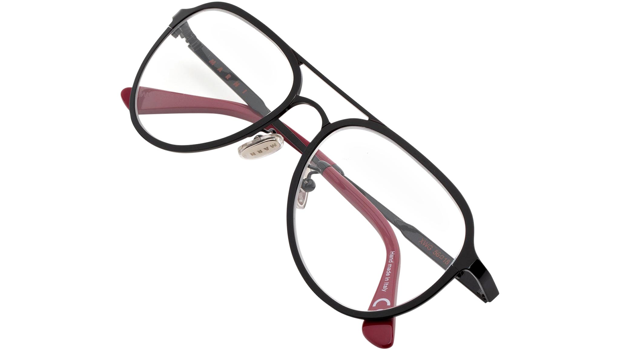 Designed exclusively for Marni, Palawan Island is an edgy optical frame conceived as an eclectic interpretation of pear-shaped aviator silhouettes. The model features thick metal rims that give it a unique bold character, capturing the distinctive flair of 1970s aesthetics. This model comes in a dark black finish with burgundy temples. Sizes: R Lens Width: 55 mm. Frame Front: Frame Side: 145 mm. Product Code Size R: XWG