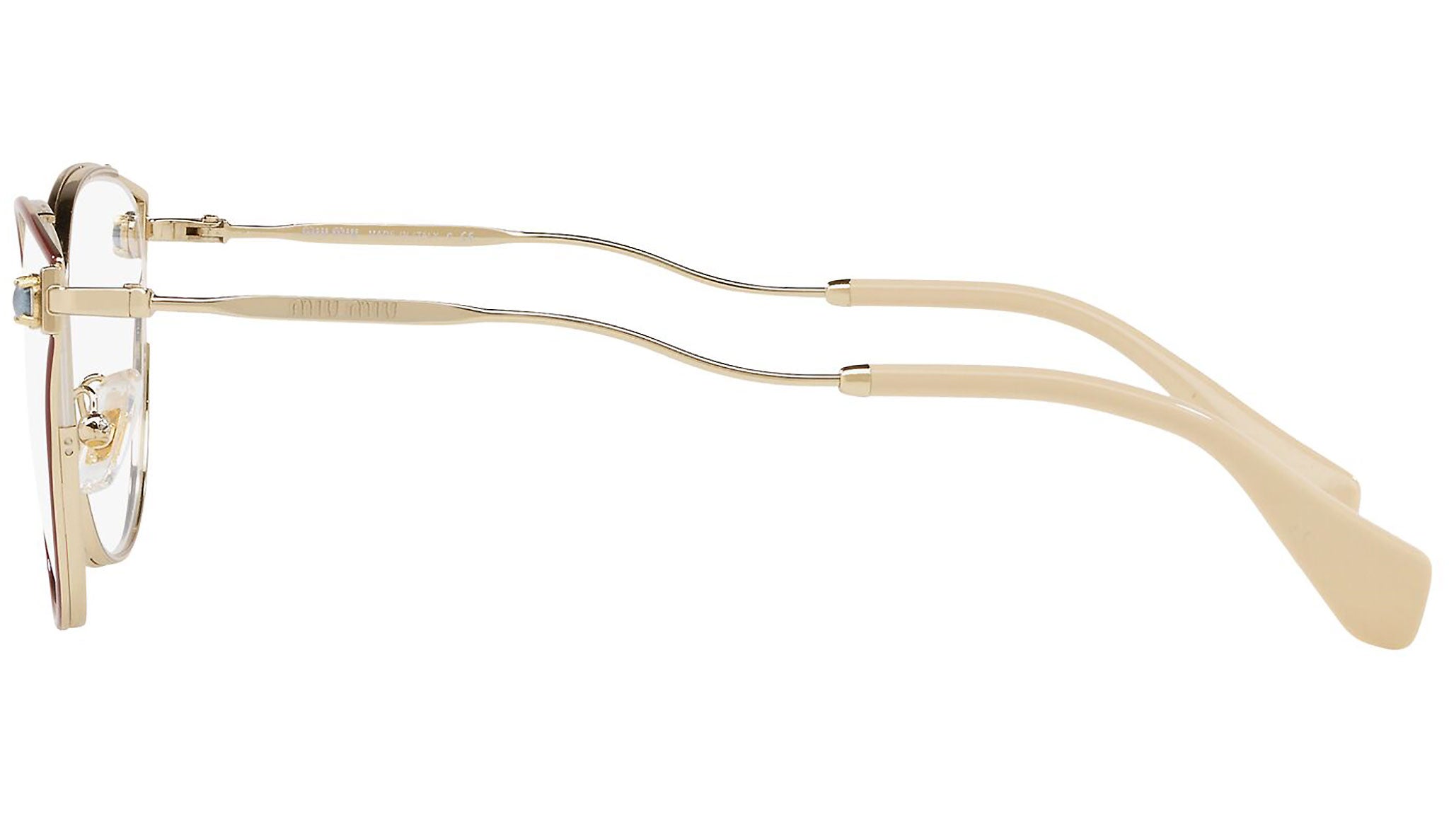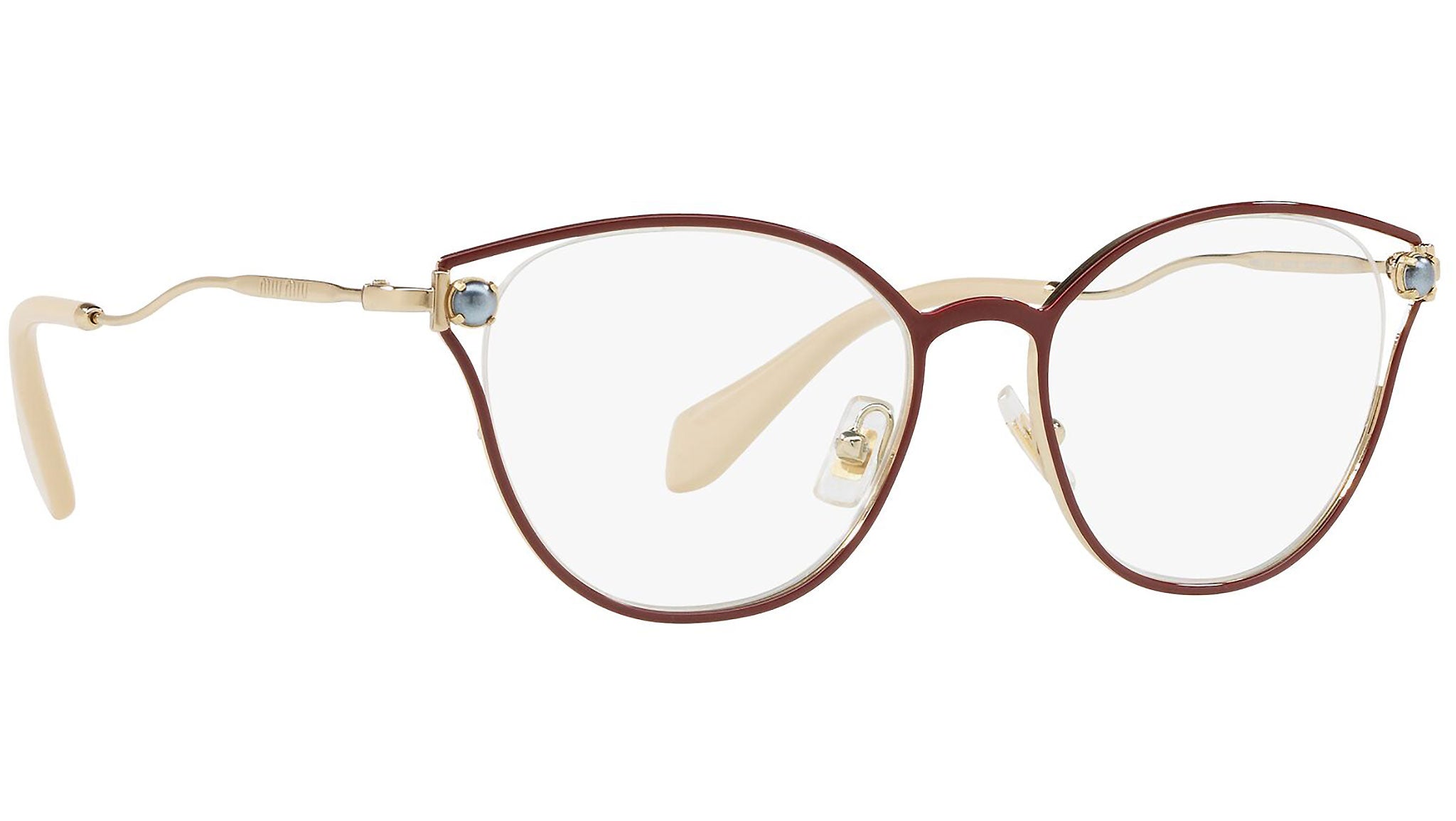 Occhiali da vista Miu Miu modello MU 53QV variante colore CCG1O1 granato. Miu Miu offre creazioni uniche, in cui la costante ricerca stilistica si combina perfettamente con la maestria artigianale della lavorazione. Le silhouette femminili e sinuose delle montature sono espressione di una ricchezza dei dettagli che rispecchia pienamente i codici stilistici e l’indiscusso talento del brand nell’unire il design non convenzionale ad un romanticismo dai rimandi retrò.