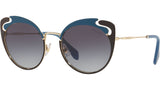Occhiali da sole Miu Miu modello MU 70US variante colore C055D1 oro chiaro / blu e marrone, con lenti color grigio sfumato. Miu Miu offre creazioni uniche, in cui la costante ricerca stilistica si combina perfettamente con la maestria artigianale della lavorazione. Le silhouette femminili e sinuose delle montature sono espressione di una ricchezza dei dettagli che rispecchia pienamente i codici stilistici e l’indiscusso talento del brand nell’unire il design non convenzionale ad un romanticismo dai rimandi retrò.