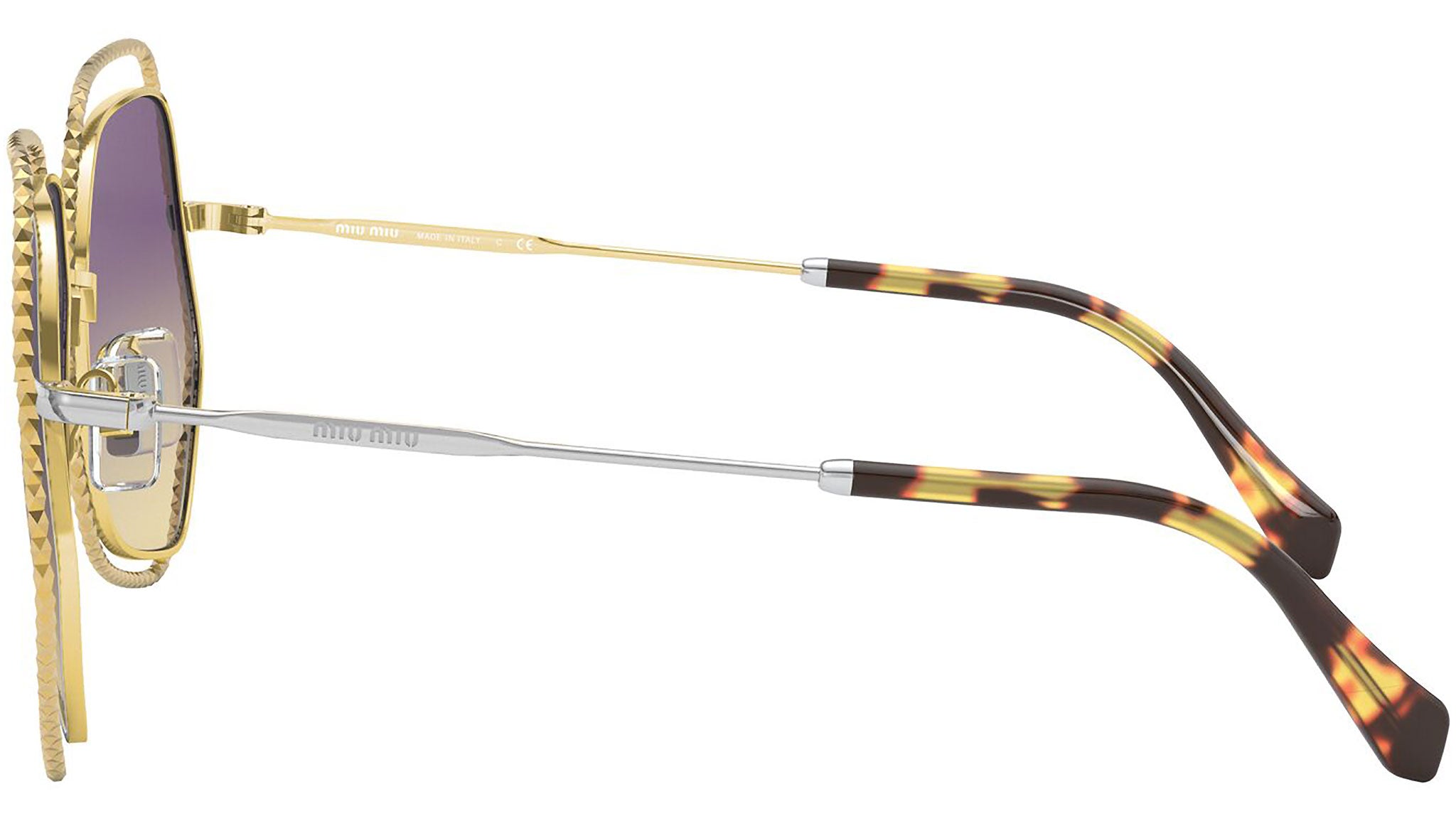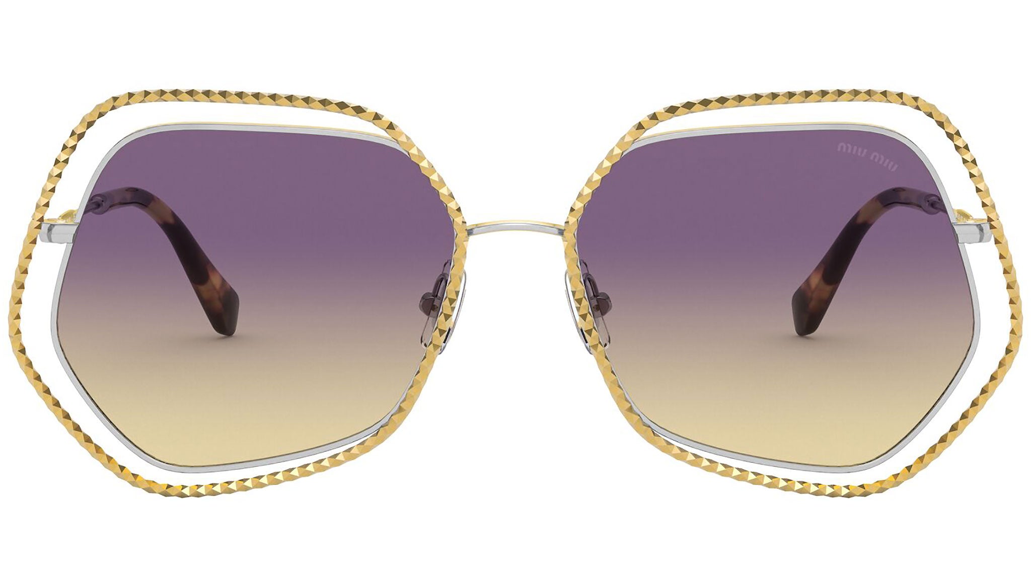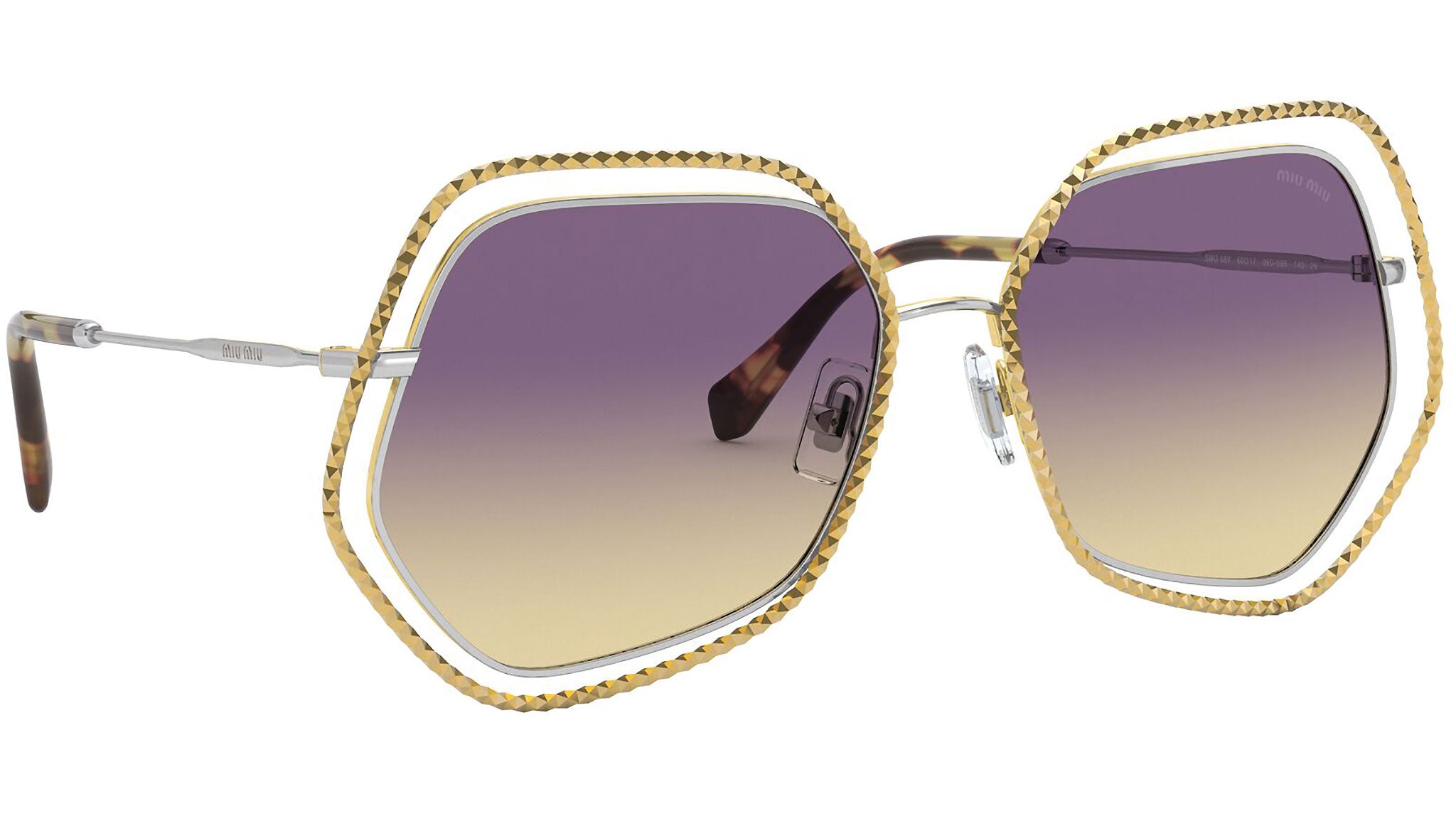 Occhiali da sole Miu Miu modello MU 58VS variante colore 09D09B oro e argento, con lenti color giallo sfumato viola. Miu Miu offre creazioni uniche, in cui la costante ricerca stilistica si combina perfettamente con la maestria artigianale della lavorazione. Le silhouette femminili e sinuose delle montature sono espressione di una ricchezza dei dettagli che rispecchia pienamente i codici stilistici e l’indiscusso talento del brand nell’unire il design non convenzionale ad un romanticismo dai rimandi retrò.