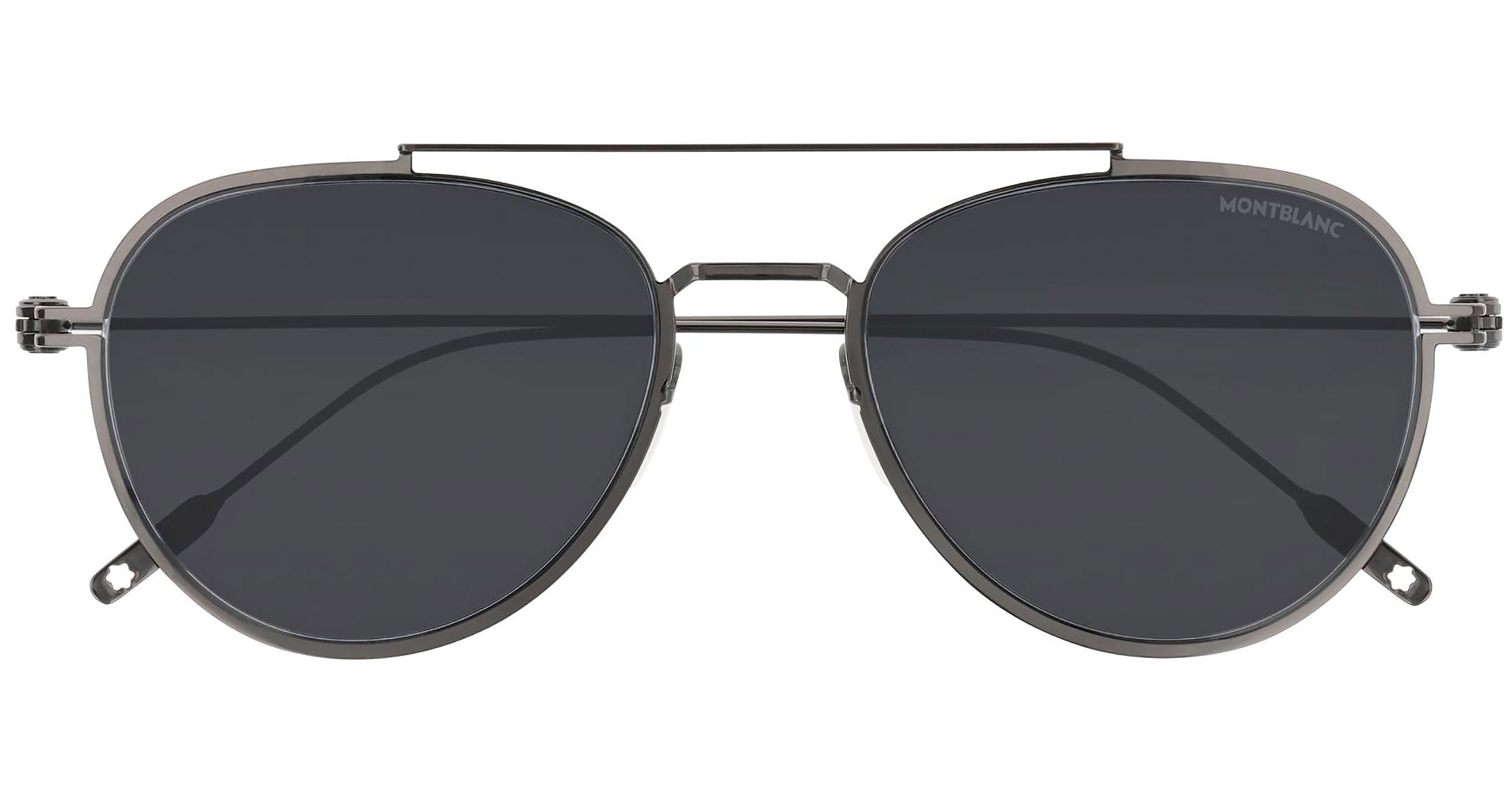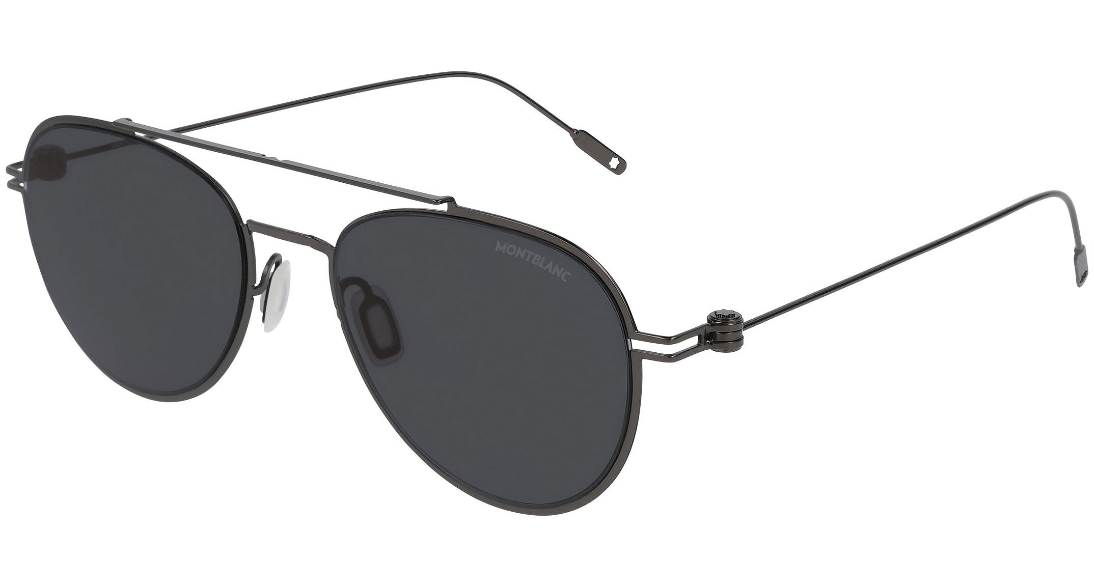 Montblanc sunglasses collection model MB0001S 001 featuring shiny dark ruthenium frame and grey lens. Montblanc revolutionized the culture of writing with breakthrough innovations. Today, the Maison continues to push boundaries and evolve the expression of fine craftsmanship across each of its product categories: the pinnacle of luxury writing instruments, timepieces, leather goods, accessories, fragrances and eyewear.