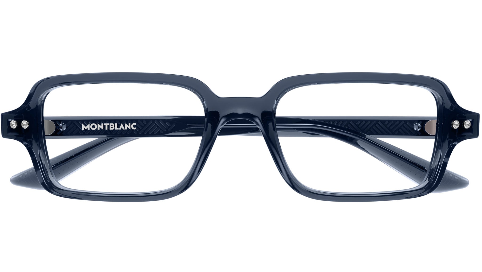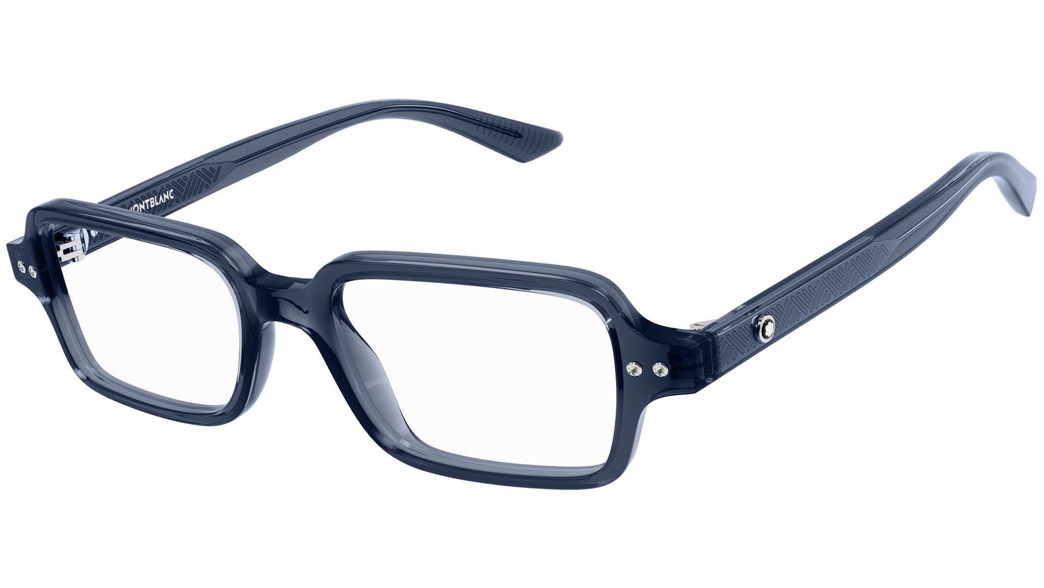 Occhiali da vista Monblanc linea Millennials modello MB0257O variante colore 003 blu trasparente lucido con astine color lenti demo.