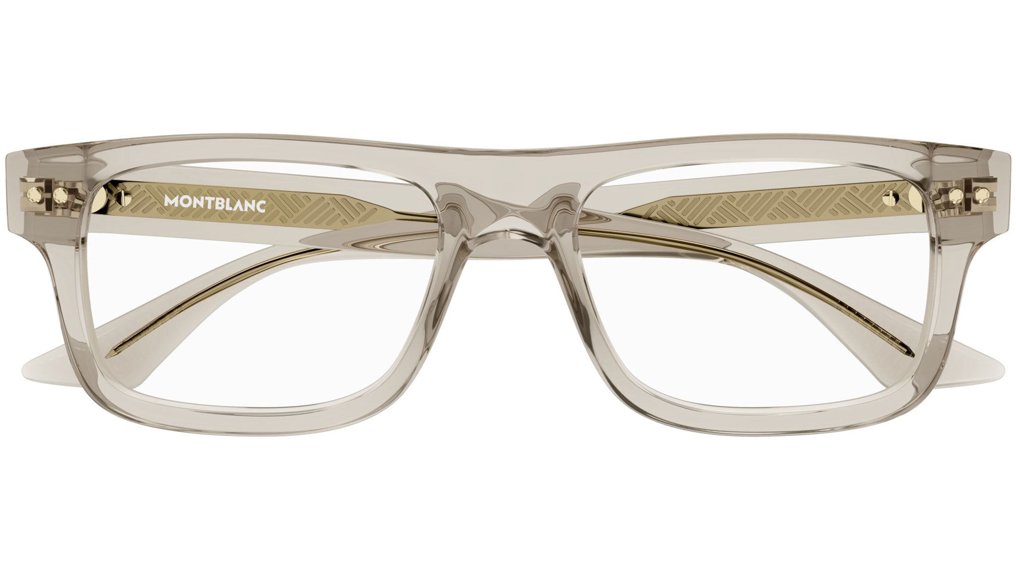 Occhiali da vista Montblanc modello MB0289O rectangle linea Snowcap in acetato riciclato, codice colore 004 beige trasparente lucido con aste color beige e lenti demo.