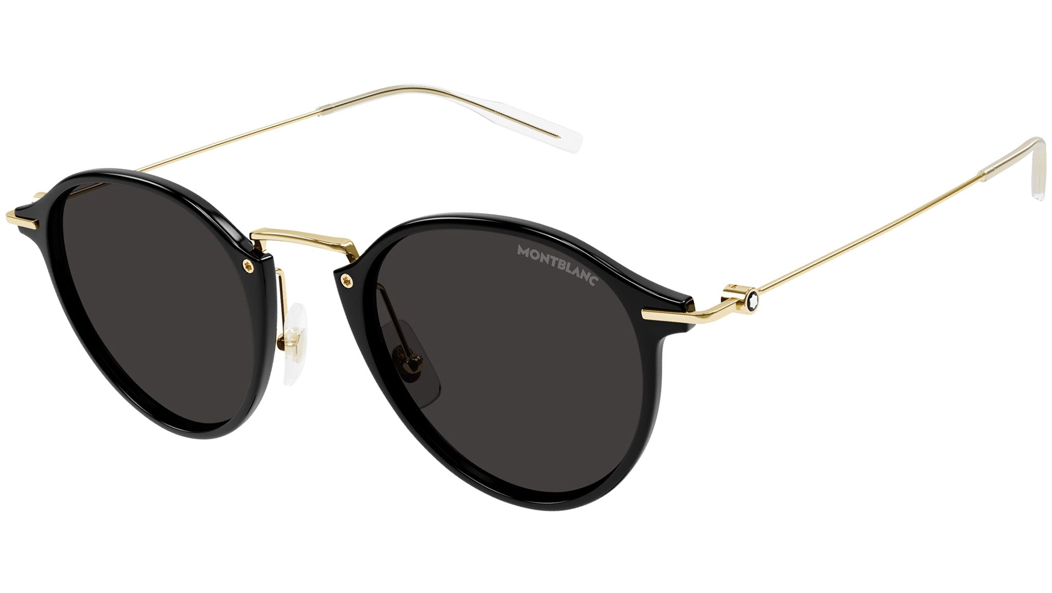 Occhiali da sole Montblanc modello MB0294S panthos linea Snowcap in injection, codice colore 001 nero lucido tinta unita / metallo oro chiaro lucido con aste color oro e lenti color grigio tinta unita.