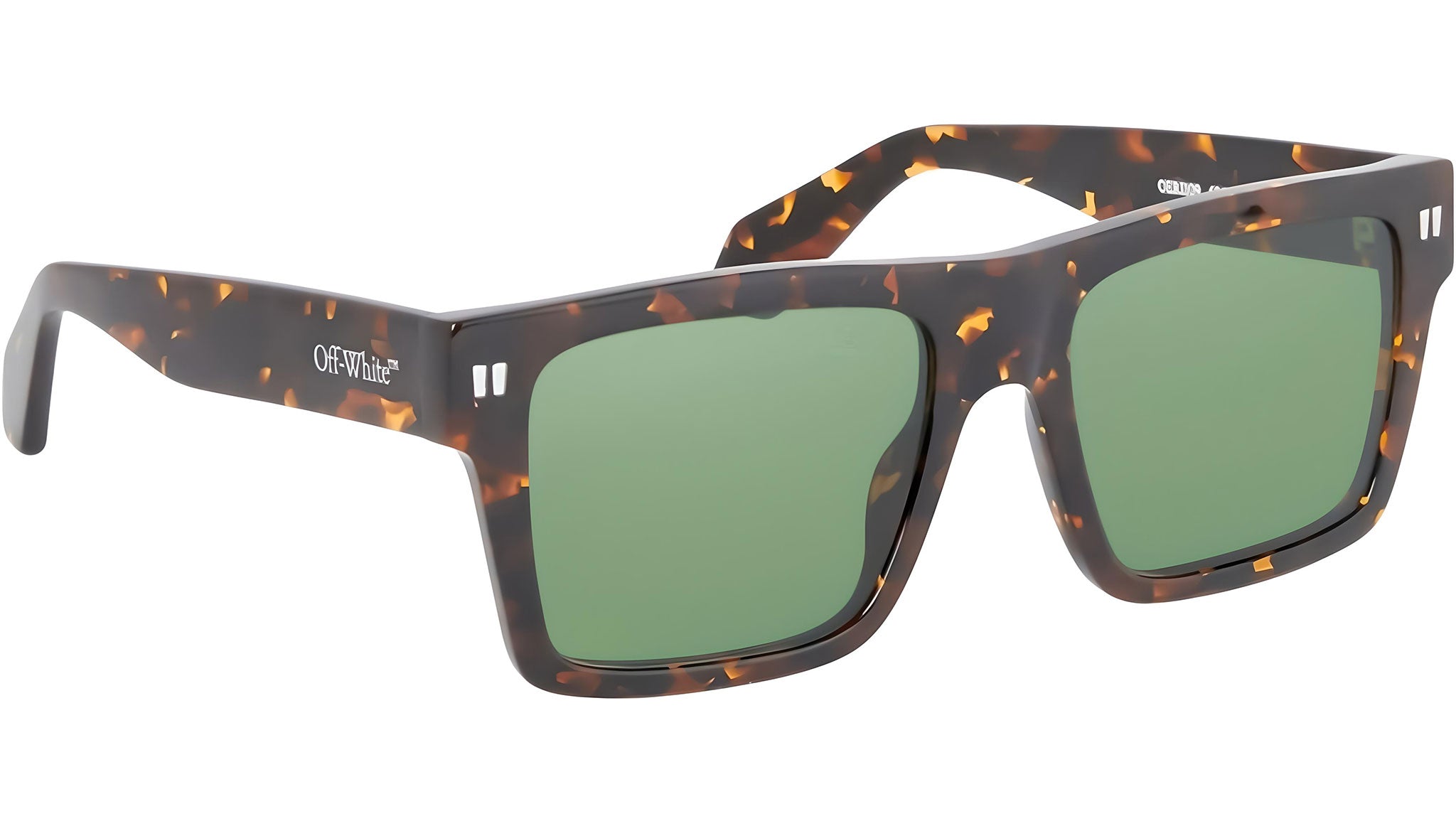 Occhiali da sole Off-White modello Lawton codice colore 6055 con frontale in acetato avana intenso e lenti cat. 3 in polimero CR-39 verde. Rivenditore autorizzato Off-White Eyewear online. Gli occhiali vengono consegnati con custodia e accessori originali e sono coperti dalla garanzia ufficiale di 12 mesi del produttore.