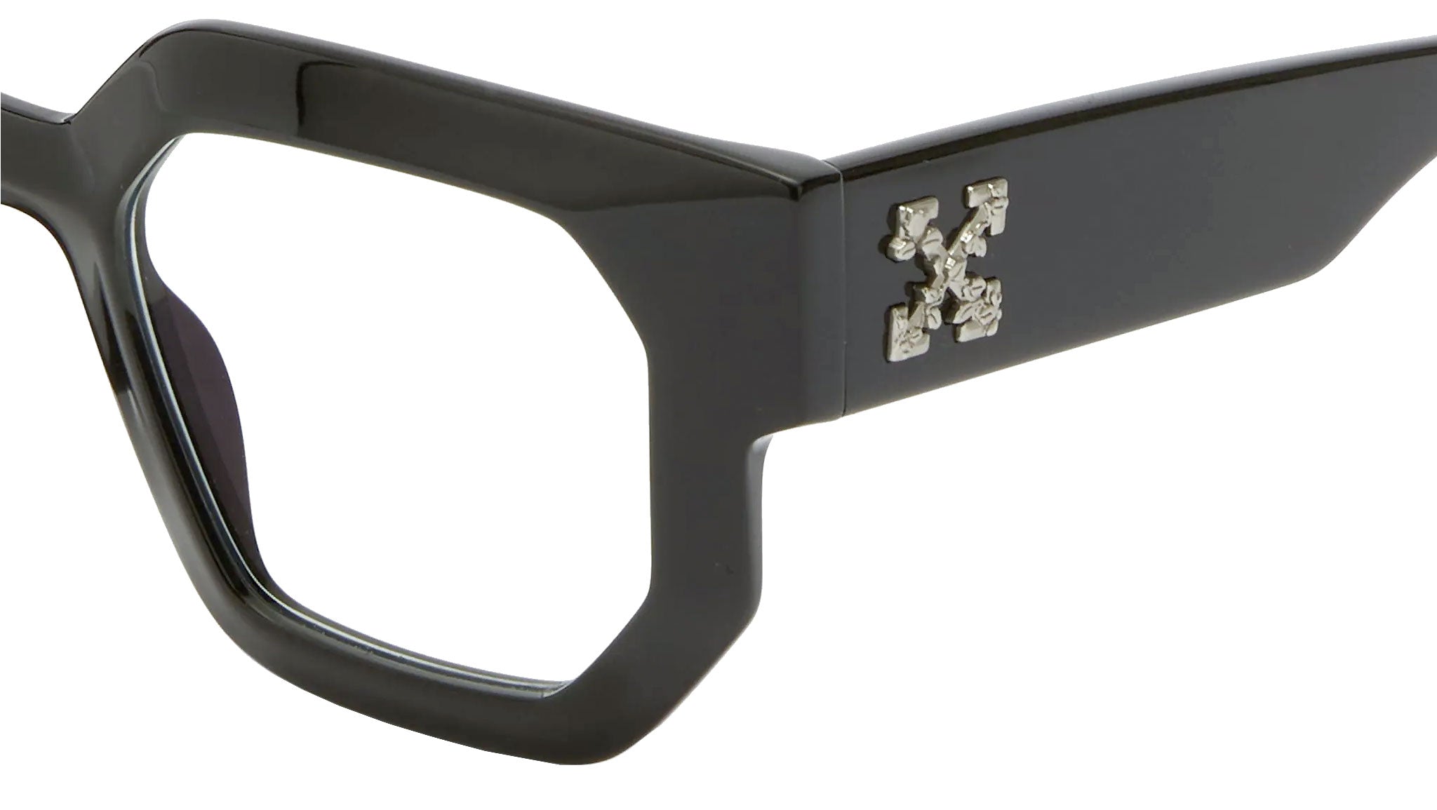 Come diceva il Direttore Creativo Virgil Abloh: "le forme sculturee sono arrivate anche sulle montature da vista". Lo stile 14 è la massima espressione della «contaminazione» di diverse geometrie, incarna perfettamente il DNA del brand. Le aste alte sono impreziosite dal logo a freccia con foglie di edera in metallo galvanizzato. Questo modello è dotato di lenti blue che bloccano i raggi degli schermi ma può supportare quelle da vista.