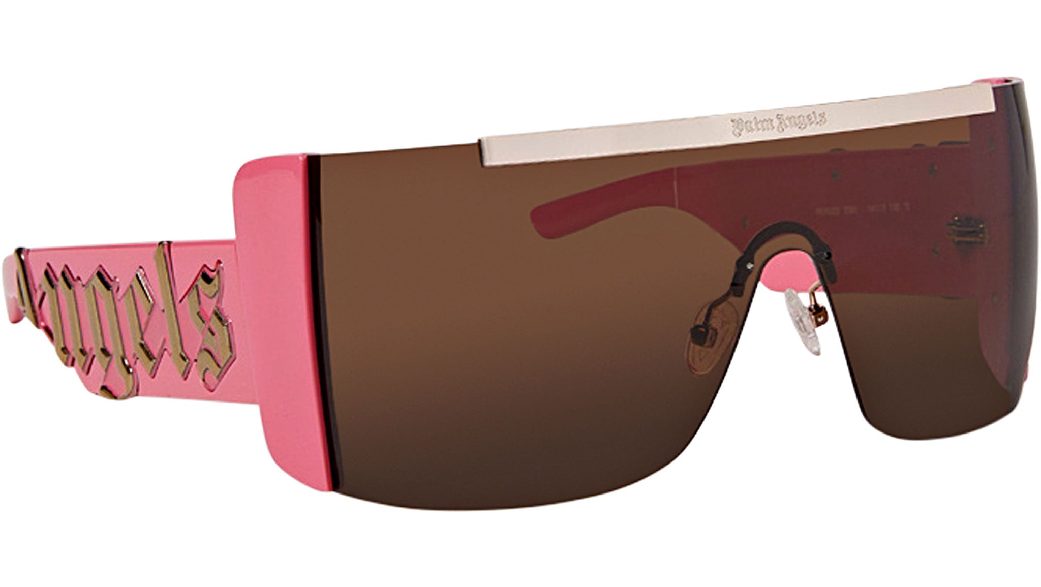 Gli occhiali da sole Losangeles di Palm Angels presentano una forma a maxi scudo: più è grande, più è Palm! Uno design oversize avvolgente, un'iconica scritta gotica, una doppia curva sulla parte frontale e laterale della montatura, una barra superiore in metallo incisa con la classica scritta Palm Angels, conferiscono ancora più carattere allo stile. Uno sguardo audace, alla moda e divertente, con spesse astine e logo in rilievo in metallo galvanizzato, per un'allure futuristica.