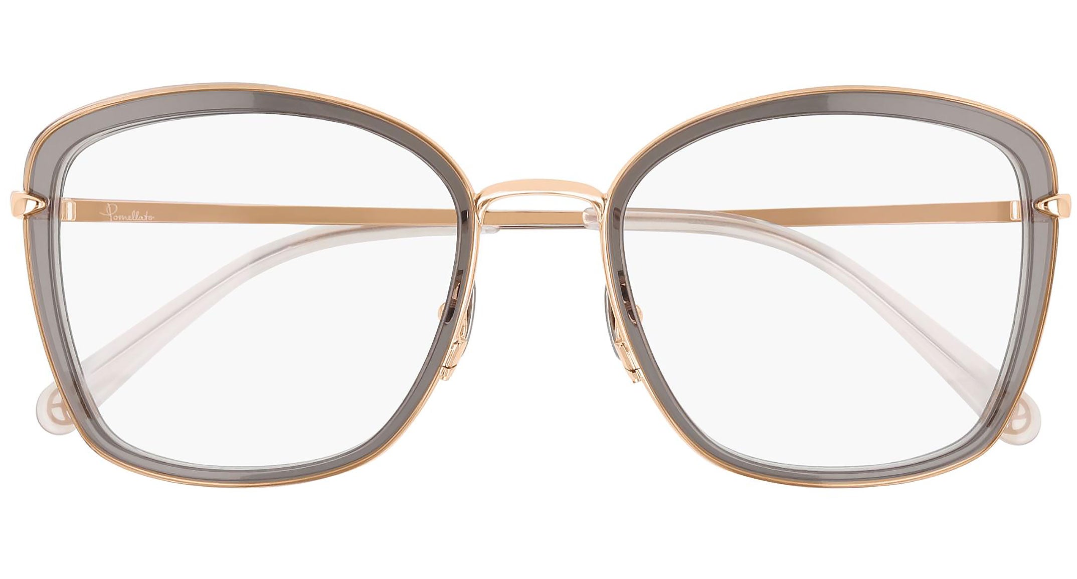 Pomellato Eyewear model PM0085O 004 featuring shiny dark grey frame and gold temple. The eyewear collection reflects the iconic, colorful and unconventional aesthetic of Pomellato, reinterpreting its voluptuous shapes and precious features in a covetable selection poised on the flawless balance between artisanal precision and timeless elegance.