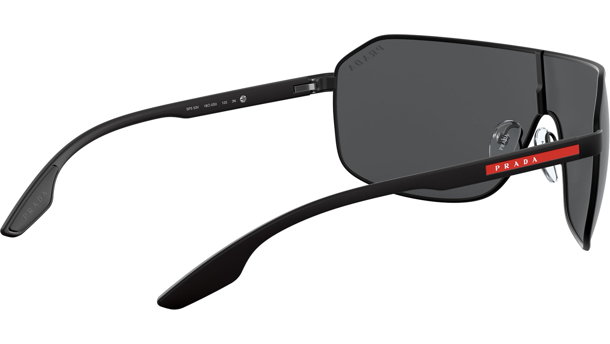 Prada Linea Rossa sunglasses model PS 53VS, matte black frame variant, color code 1BO5S0 with grey lens. Prada Linea Rossa Sun Collection conveys an everyday casual style with all the quality and craftsmanship of the Prada brand.