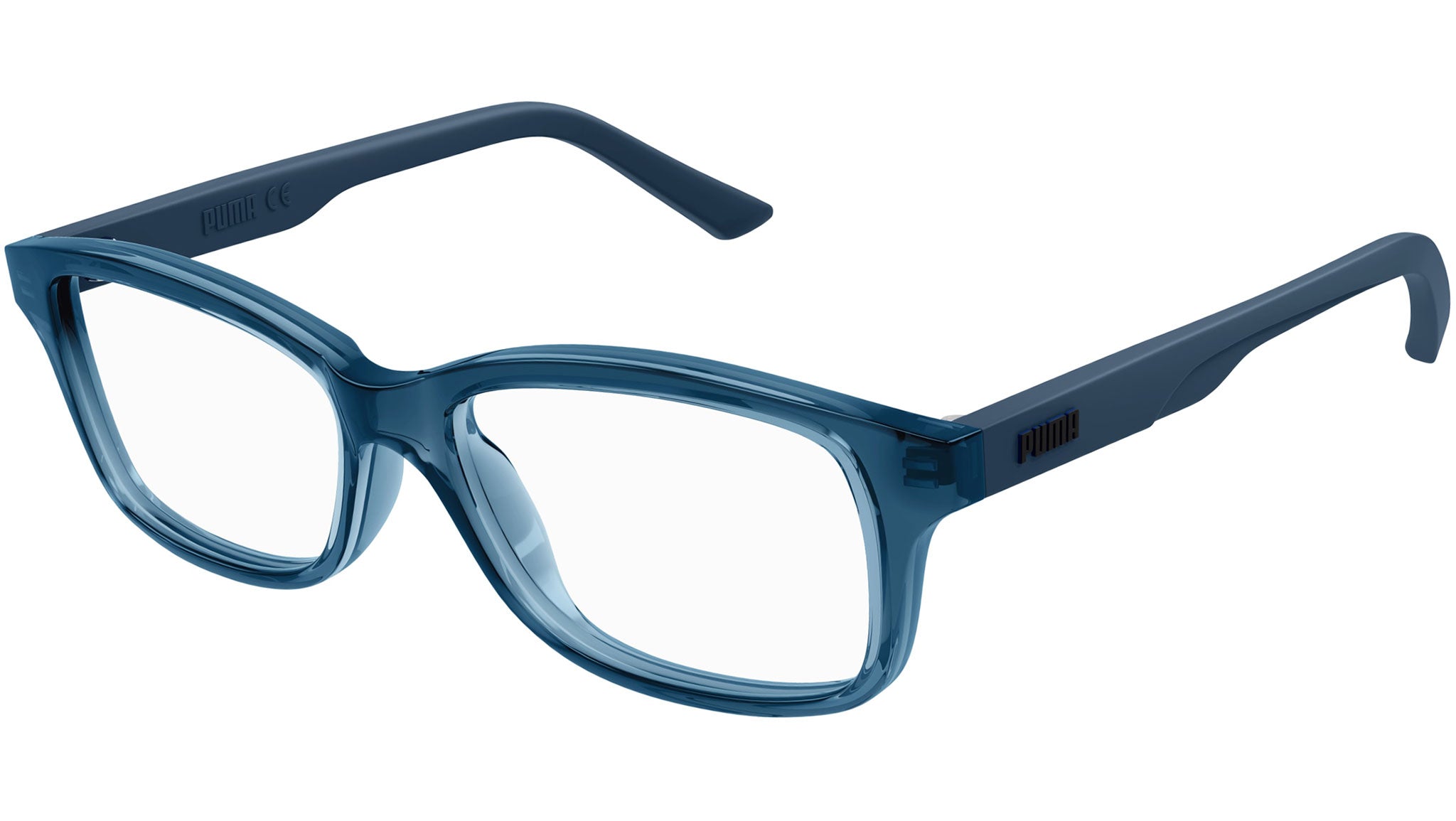 Occhiali da vista Puma Junior modello PJ0072OA variante colore 003 blu di prussia traspatente lucido con lenti demo.