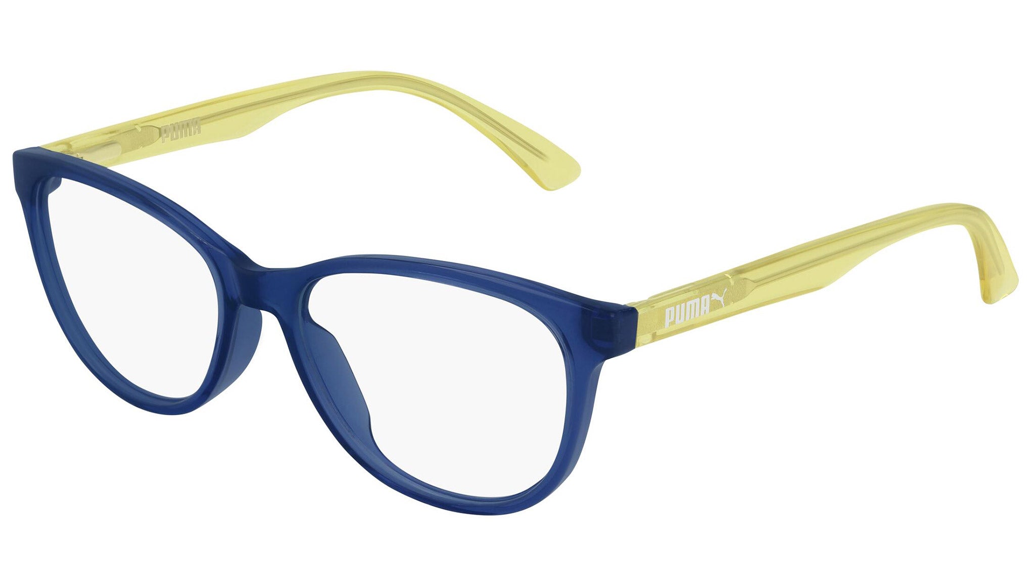 Puma for Kids model PJ0018O 006 shiny transparent blue optical frame. These kids are on the move. They roam the streets in search for recognition, emotions and daily kicks: celebrating with friends at the Luna Park, a thrilling jump, a trick on a skateboard, or simply seeing something new.