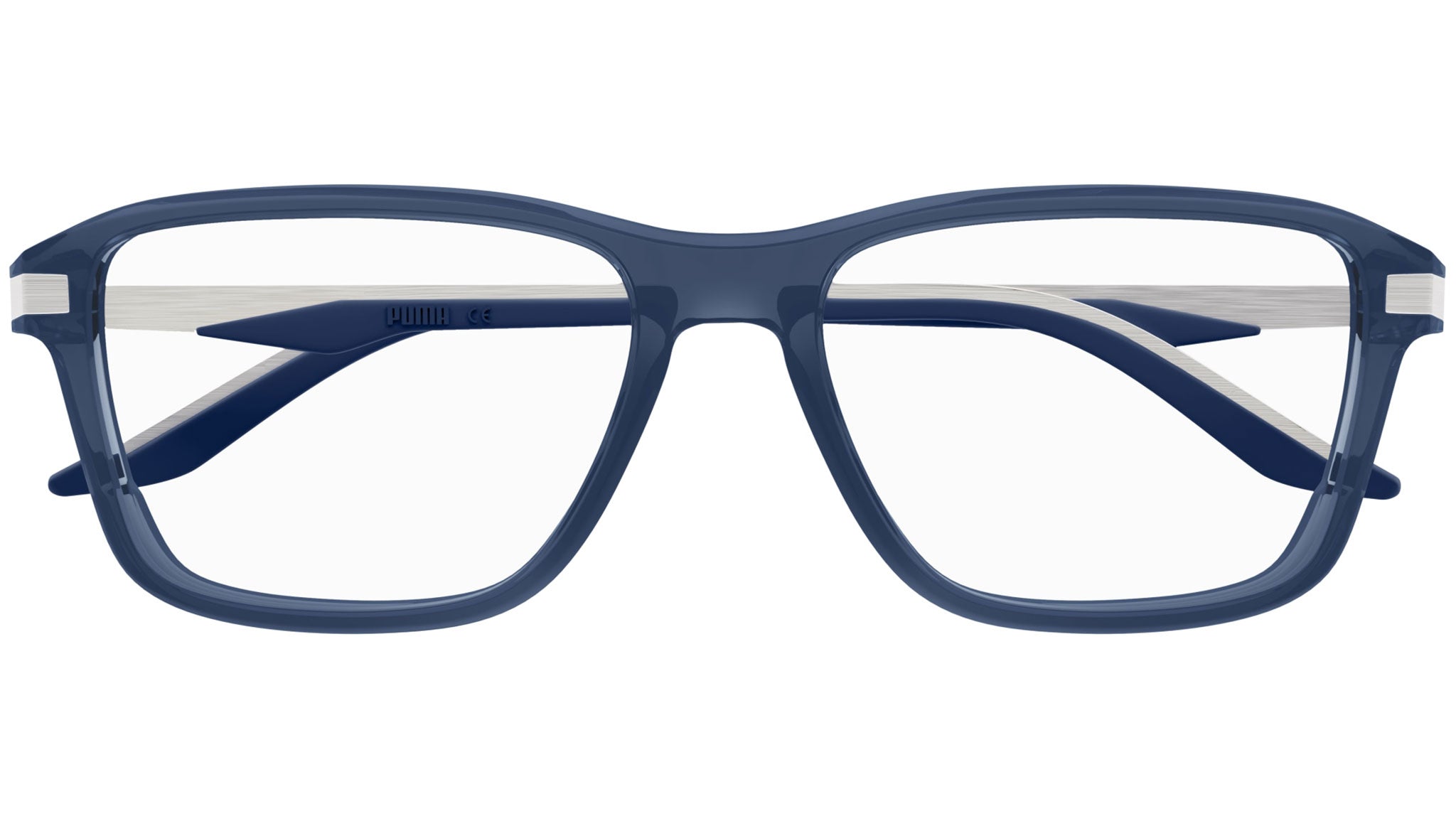 Occhiali da vista Puma Active modello PU0409O variante colore 003 blu opaco trasparente con astine color argento.