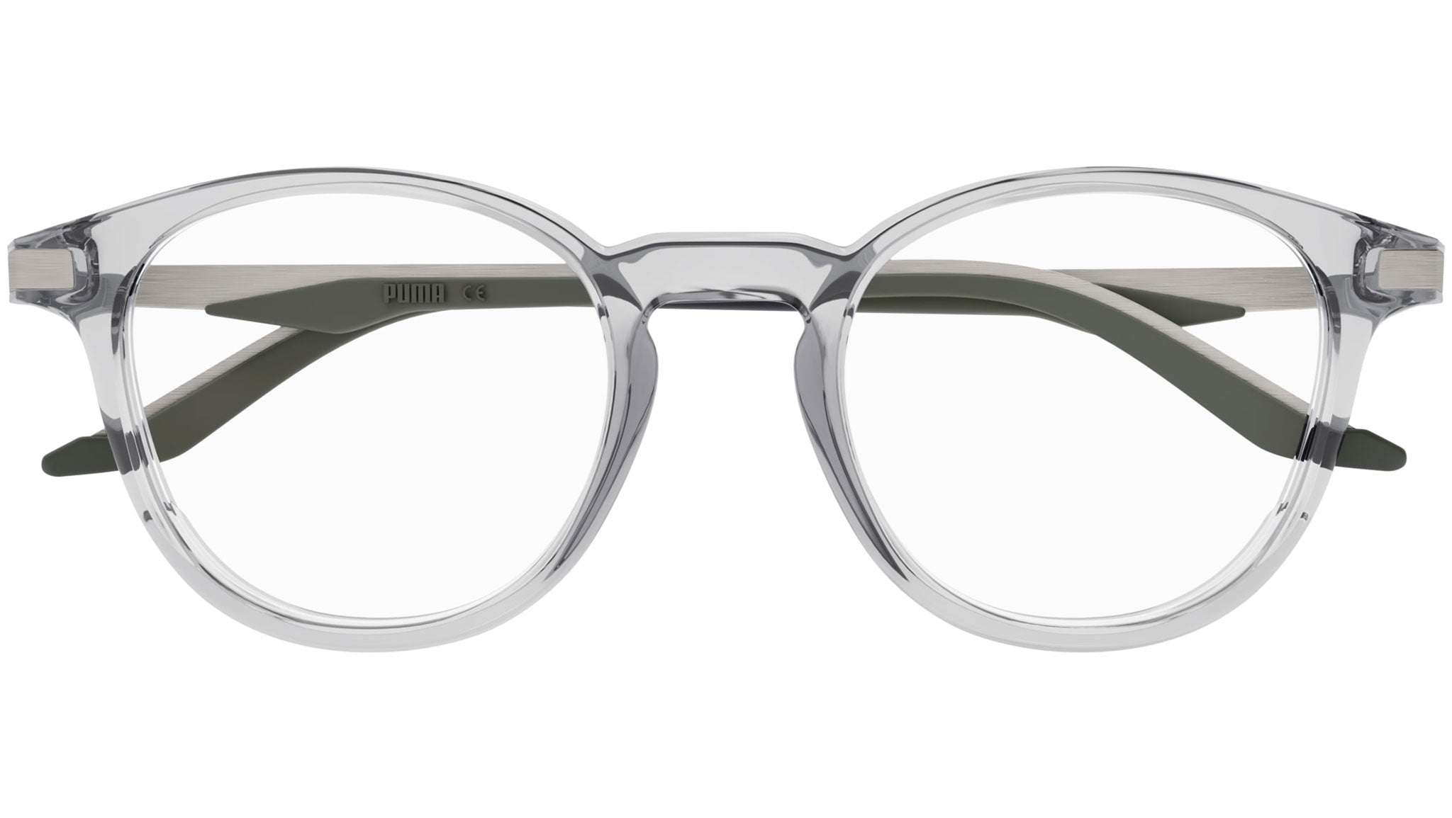 Occhiali da vista Puma Sport modello PU0412O variante colore 002 grigio chiaro trasparente lucido con lenti demo.