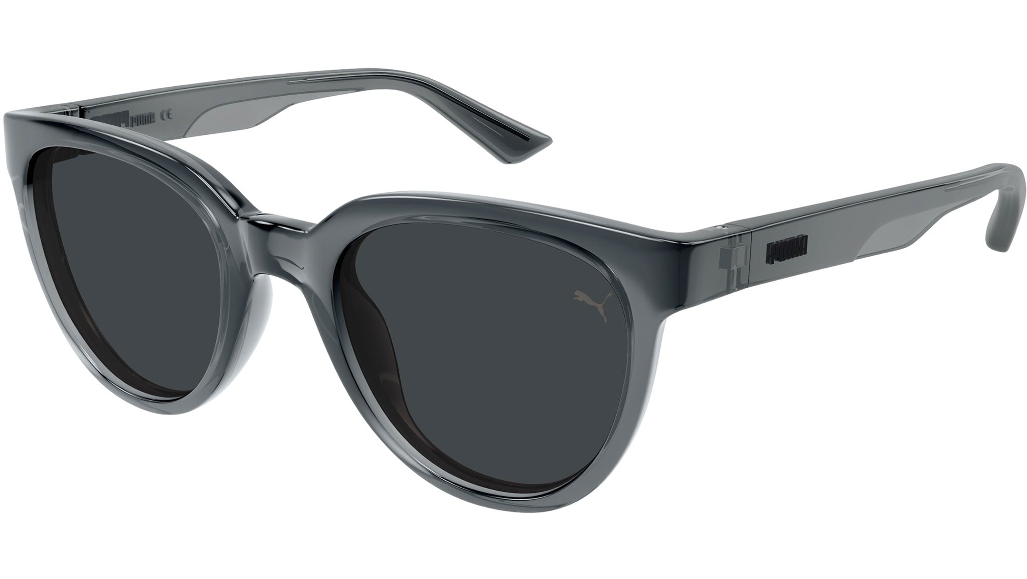 Occhiali da sole Puma Sport modello PU0423S variante colore 001 grigio scuro trasparente lucido con lenti color grigio fumo tinta unita.