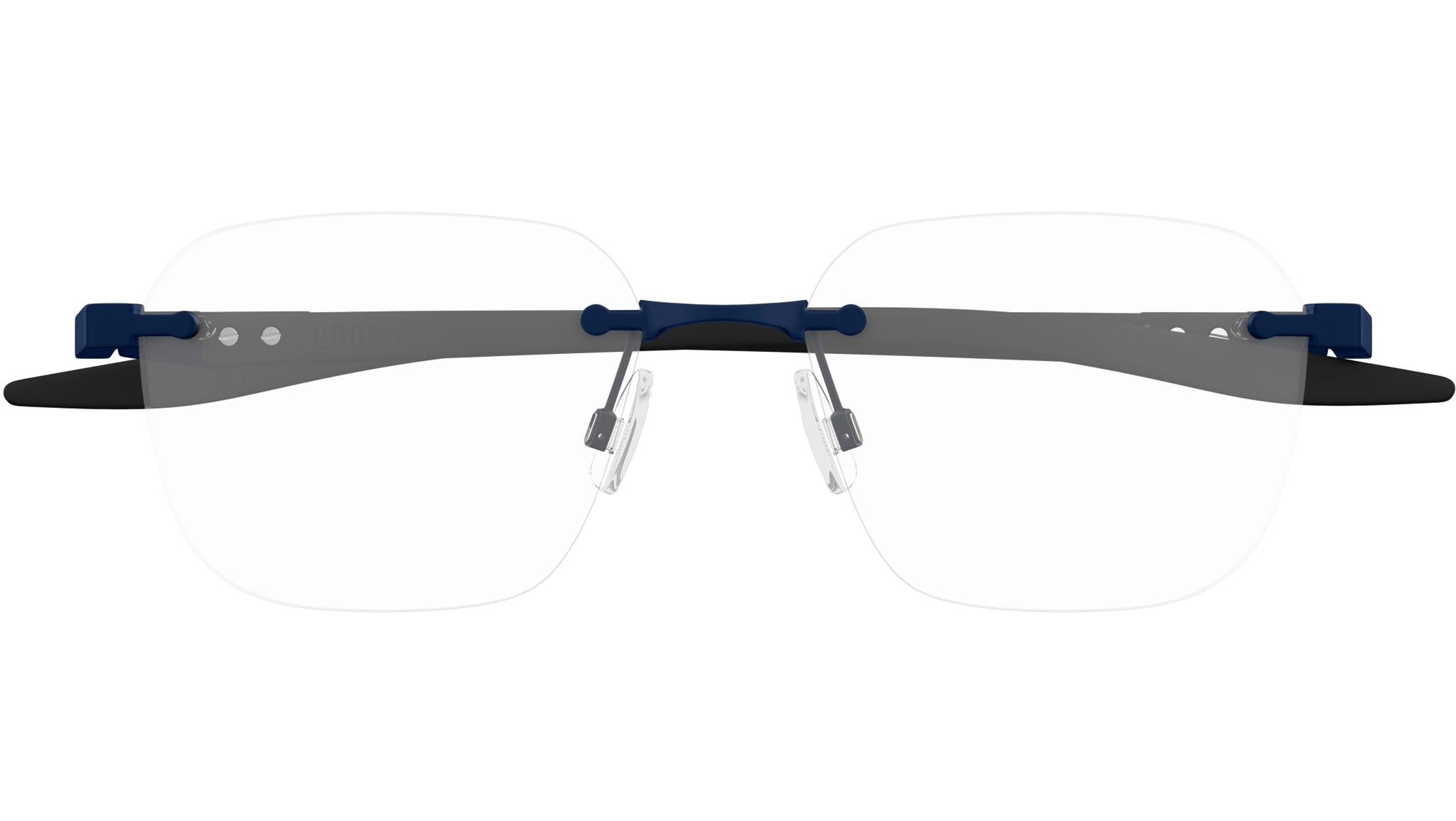 Occhiali da vista Puma Tech modello PU0457O variante colore 004 blu verniciato semiopaco trasparente con lenti demo. Rivenditore autorizzato Puma online. Gli occhiali vengono consegnati con custodia e accessori originali e sono coperti dalla garanzia ufficiale di 12 mesi del produttore.