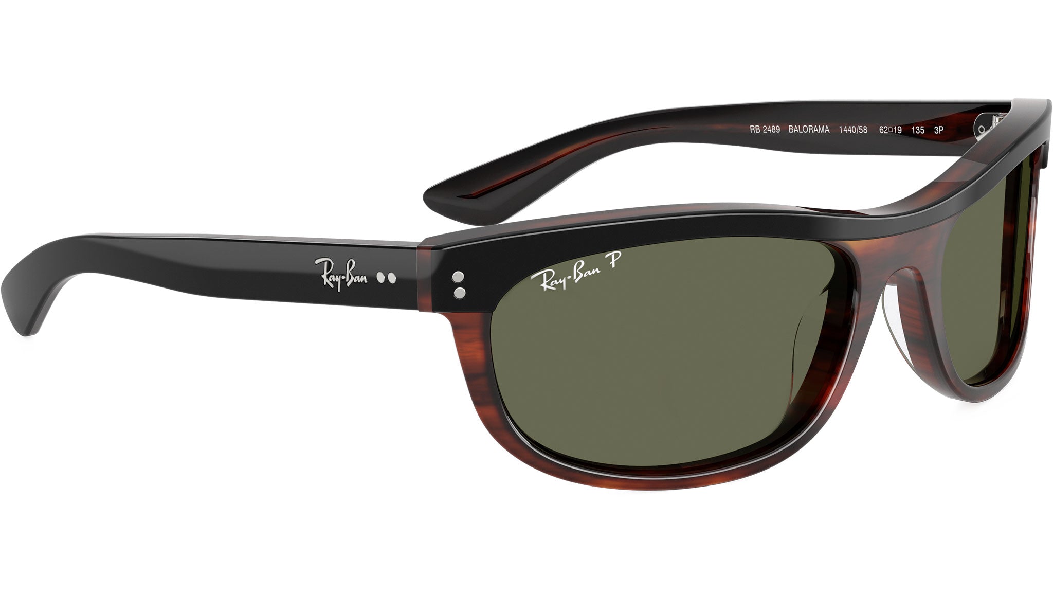 Occhiali da sole Ray-Ban Balorama RB2489 144058 unisex con montatura rettangolare in acetato nero su avana e lenti in cristallo color verde polarizzato. Vestibilità a ponte alto. Linea: Evolution. Codice modello: 0RB2489. Codice colore: 144058. Rivenditore autorizzato Ray-Ban online. Gli occhiali vengono consegnati con custodia e accessori originali e sono coperti dalla garanzia ufficiale di 12 mesi del produttore.