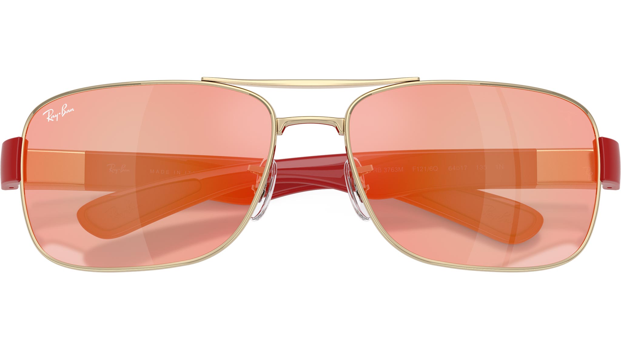 Occhiali da sole Ray-Ban 0RB3763M RB3763M F1216Q unisex con montatura squadrata in metallo argento e lenti in poliammide color marrone a specchio rosso giallo. Naselli regolabili. Linea: Ferrari. Codice modello: 0RB3763M. Codice colore: F1216Q. Rivenditore autorizzato Ray-Ban online. Gli occhiali vengono consegnati con custodia e accessori originali e sono coperti dalla garanzia ufficiale di 12 mesi del produttore.