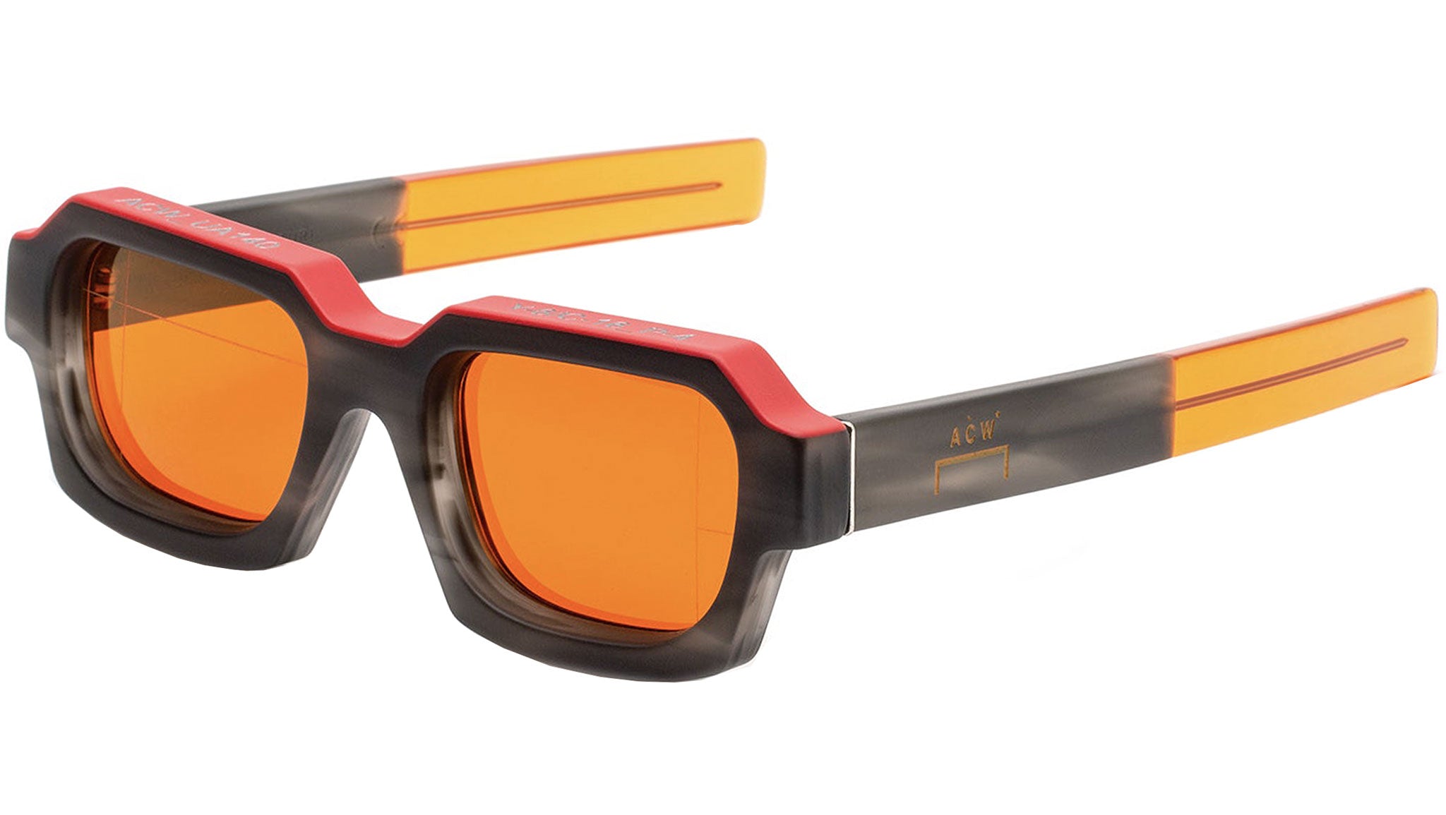 Designed for the cult British menswear brand A Cold Wall, this version of Caro is a statement piece of eyewear characterized by its ultra-thick profile and squared lenses. The model’s geometric design has been crafted from solid acetate to emphasize the materiality of the shape. This aesthetic language draws from ACW’s exploration of architectural design qualities, applying it to high-end fashion. This version features a matte grey marble finish on the frontal frame and temples, with solid orange detailing on the top. Matching tinted lenses and crystal temple tips complete the piece.