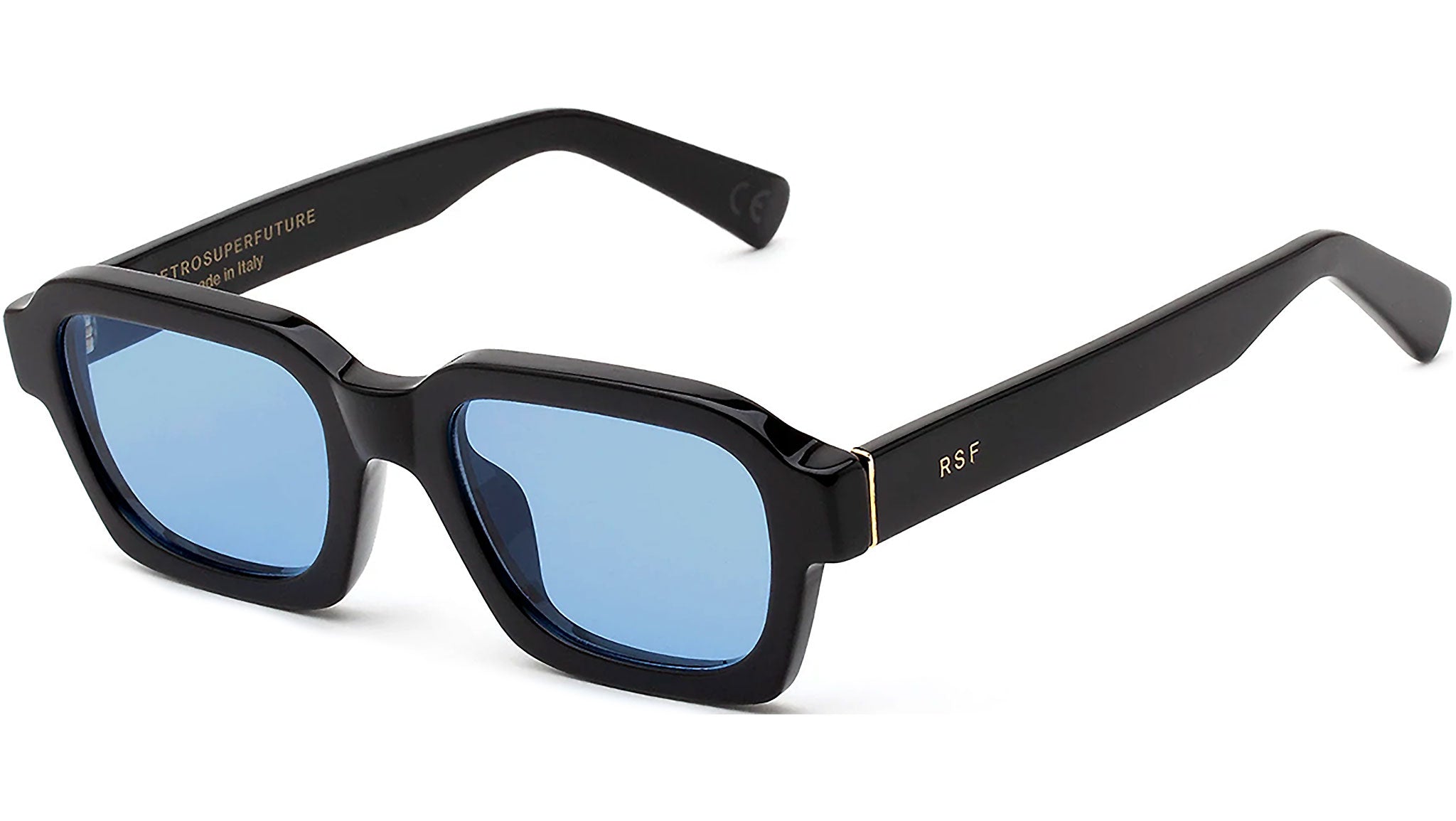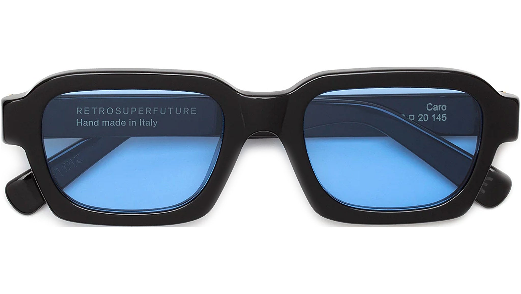 Caro is a wide, geometric silhouette that blends 1960s Italianclassicism with 1990s grunge aesthetic. The model features a well-rounded design with a thick, sturdy acetate structure, squared temple tips and angular rims on the lower half of the frame. This version of Caro comes with blue lenses and an all-black acetate.