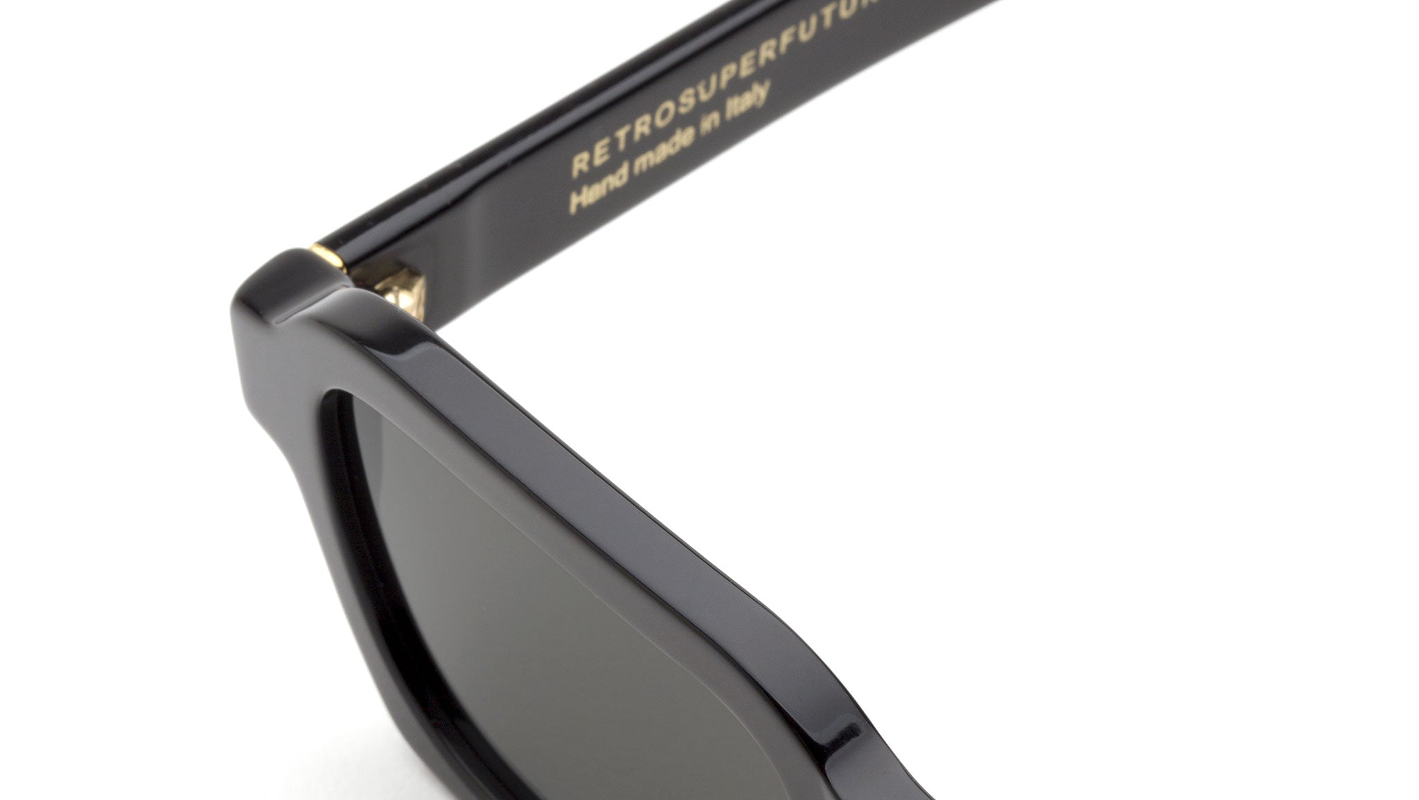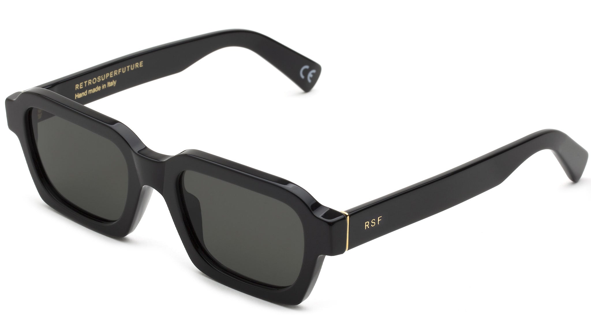 Caro is a wide, geometric silhouette that blends 1960s Italianclassicism with 1990s grunge aesthetic. The model features a well-rounded design with a thick, sturdy acetate structure, squared temple tips and angular rims on the lower half of the frame. This version of Caro comes with black lenses and an all-black acetate.