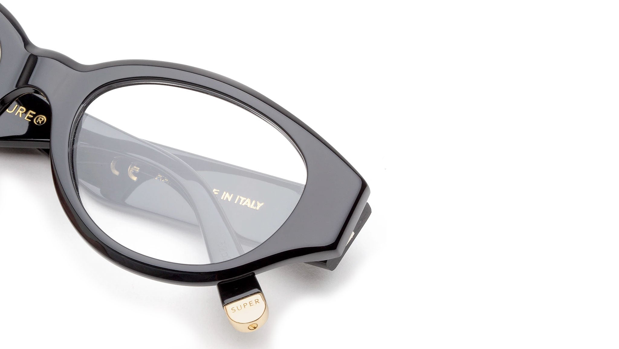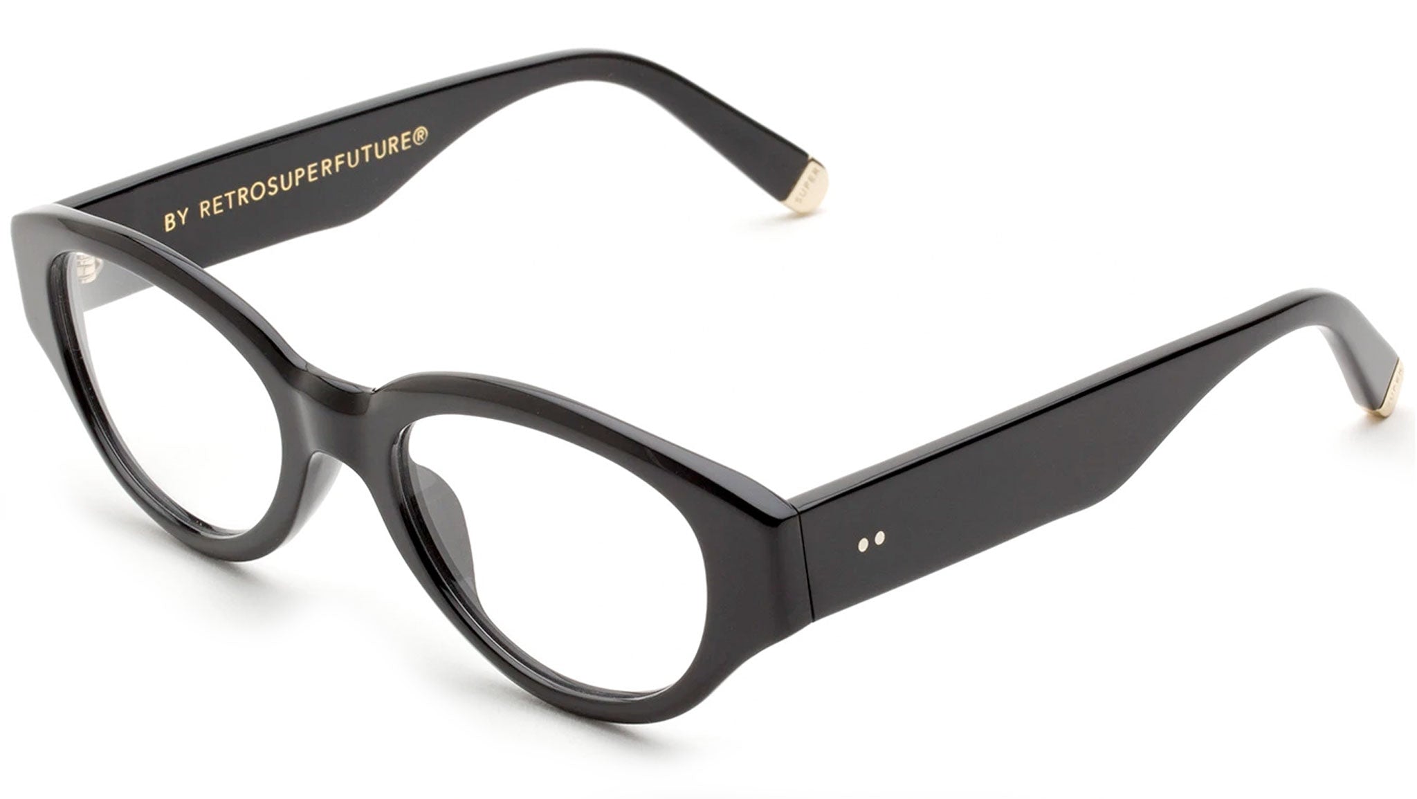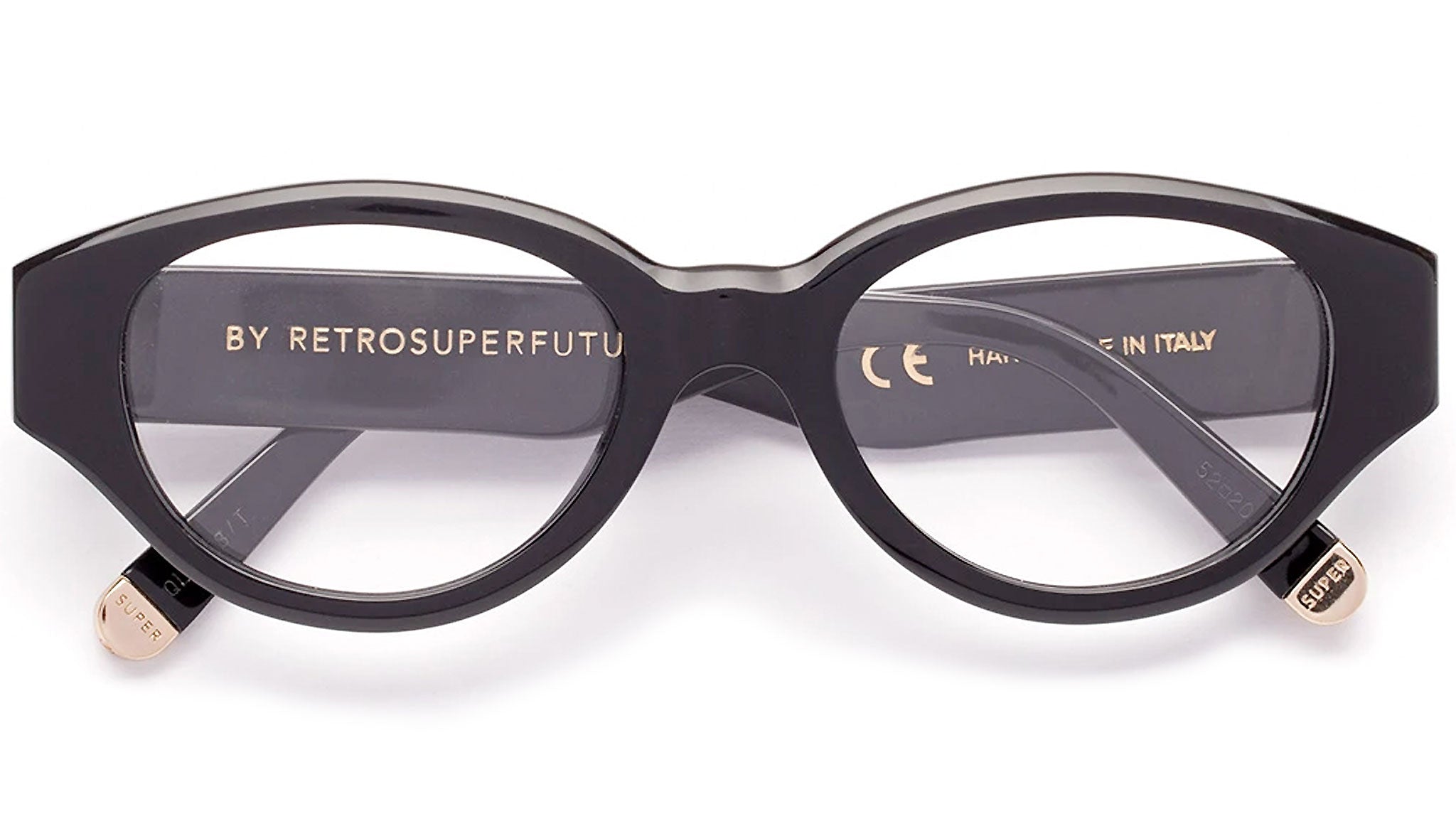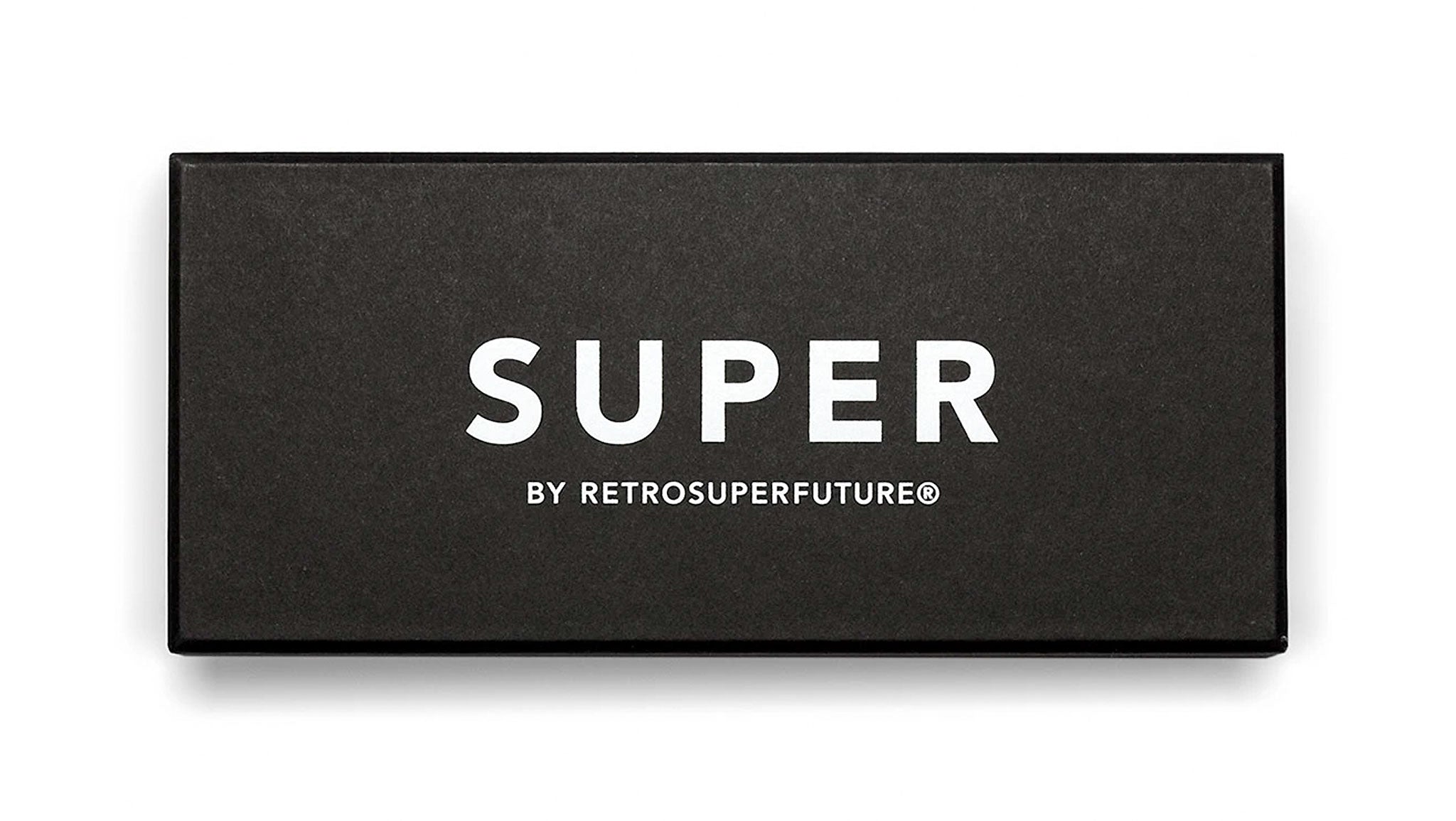 Drew Mama takes an absolute icon of Super’s designs, reinterpreting it for optical use. The model is characterized by thick temple tips and oversized, oval lenses crafted from shiny black acetate. Prescription lenses not included. The box contains a hard case and a cleaning cloth.