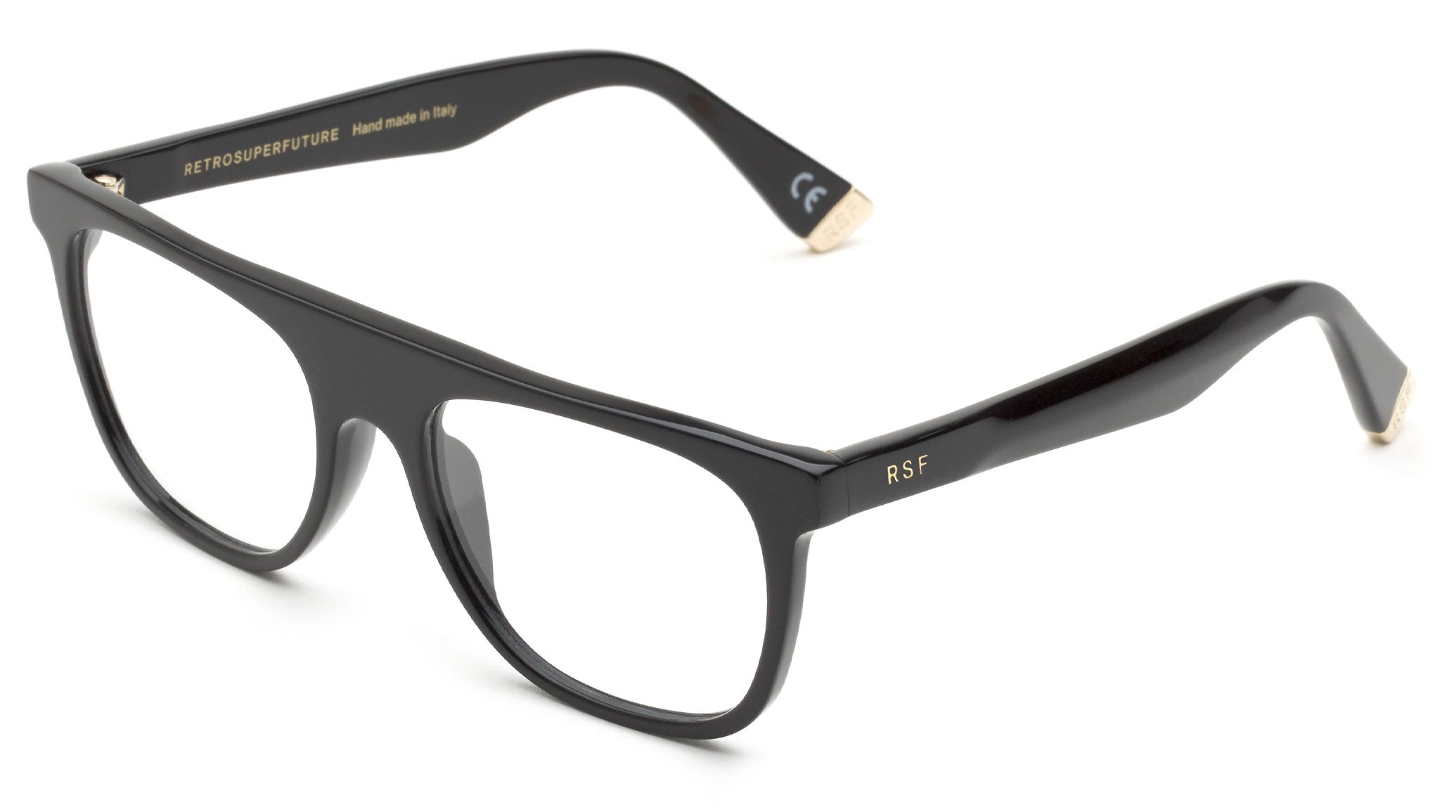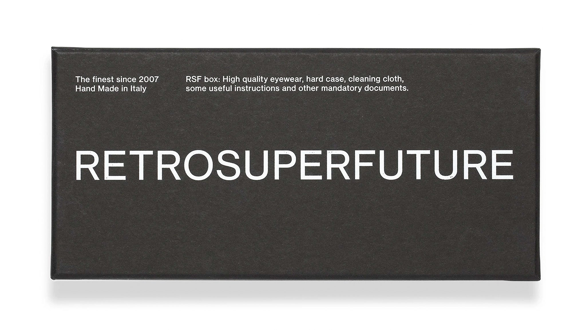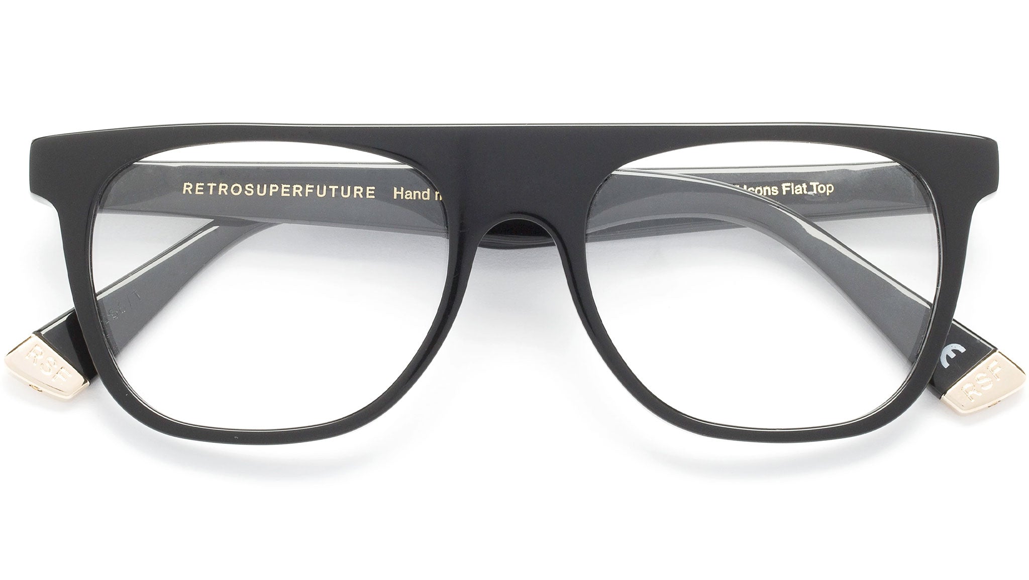 Flat Top is a stand-out optical frame that reinterprets the iconic RSF silhouette for an all-day-every-dayuse. A bold model, Flat Top features a straight upper line with a thick nose-bridge and temples. Light and fitted for a full day wear, this version of Flat Top comes in a shiny black acetate. Prescription lenses not included.The box contains a hard case and a cleaning cloth.