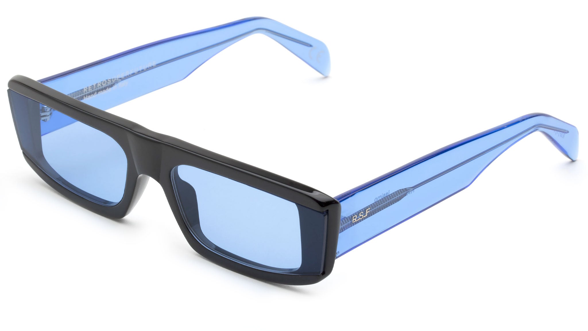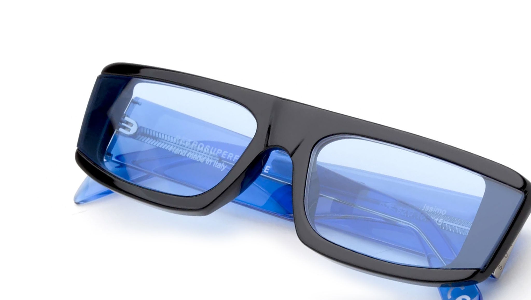 Issimo is a streamlined, low-ridingshape that captures the sports-infused aesthetics. Issimo features angular curves, thick temples and wide horizontal lenses, mounted on top of the acetate frame for a sharp stylistic edge. This version of Issimo comes with blue tinted lenses, black acetate on the front and electricblue temples. The box contains a semi-hard case and a cleaning cloth.