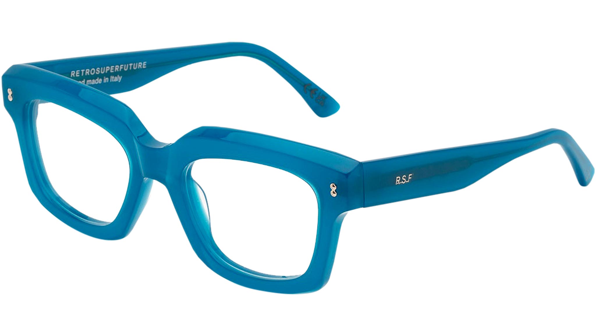 Numero 118 by Retrosuperfuture is a unique silhouette that reinterprets timeless vintage frames with a fresh, contemporary design. Characterized by thick, sturdy rims, the model features two studs on the temples and a keyhole nose-bridge, in reference to 1950s shapes. Its bold proportions and oversized lenses update this classic shape for a sharp modern aesthetics. This silhouette comes in a vibrant blue acetate with silver detailing. Sizes: R Lens Width: 52 mm. Frame Front: Frame Side: 145 mm. Product Code Size R: WSY