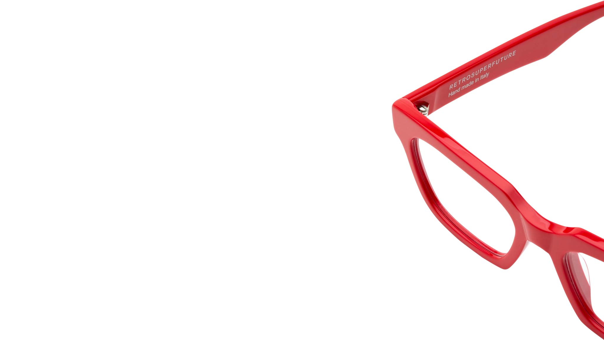 Numero 90 by Retrosuperfuture is an edgy contemporary silhouette with a horizontal, wide shape. Squared lenses with slanted carved rims for lightness, thick acetate brow-line and angular temple tips, highlight its distinctive character. This version comes in bright red acetate. Prescription lenses not included. Sizes: R Lens Width: 52 mm. Frame Front: 146 mm. Frame Side: 145 mm. Product Code Size R: VE6