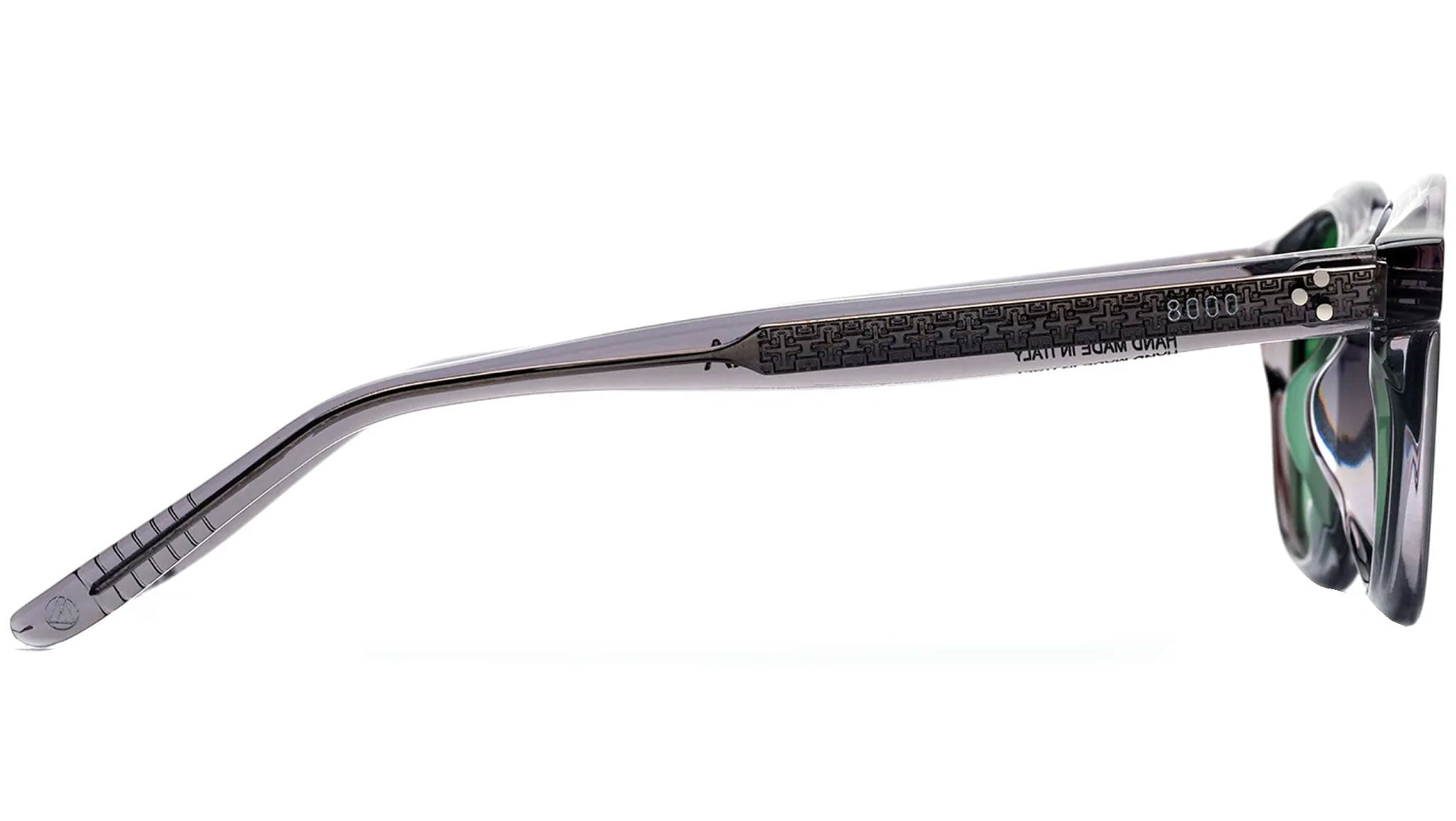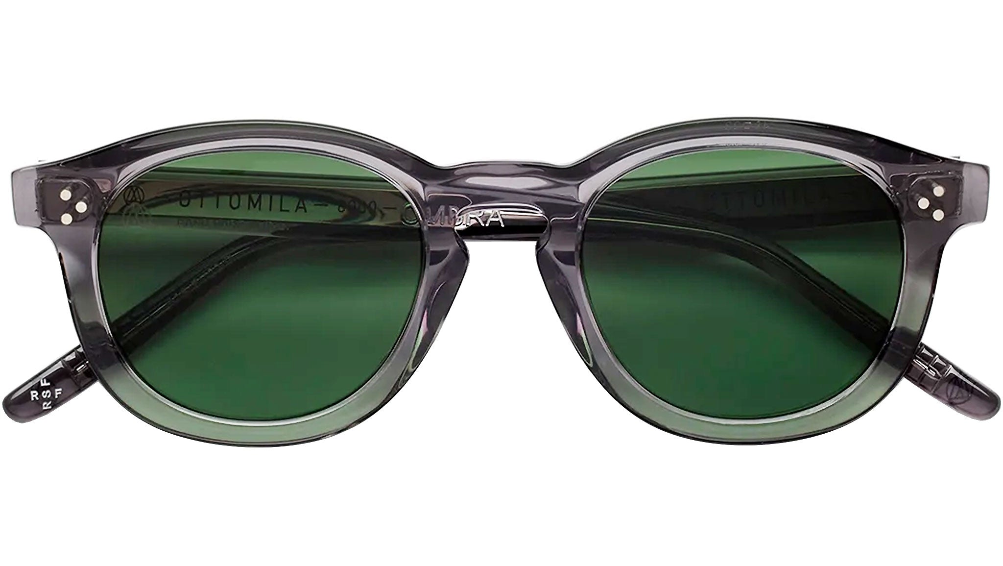 A timeless piece of eyewear designed for Ottomila, a high-end brand known for its meticulous approach to design and craft. Ombra is a contemporary reinterpretation of classic 1950s silhouettes, characterized by a keyhole nose-bridge and rounded lenses. Its curved rims were crafted from thick and sturdy Italian acetate, and carved on the sides to reveal precise, geometric edges. Minute metalwork and inscriptions complete the piece. This version comes in forest green lenses and grey semi-transparent acetate. This translucent effect highlights the personalized metal core with Frank Lloyd Wright pattern decoration in the temples-