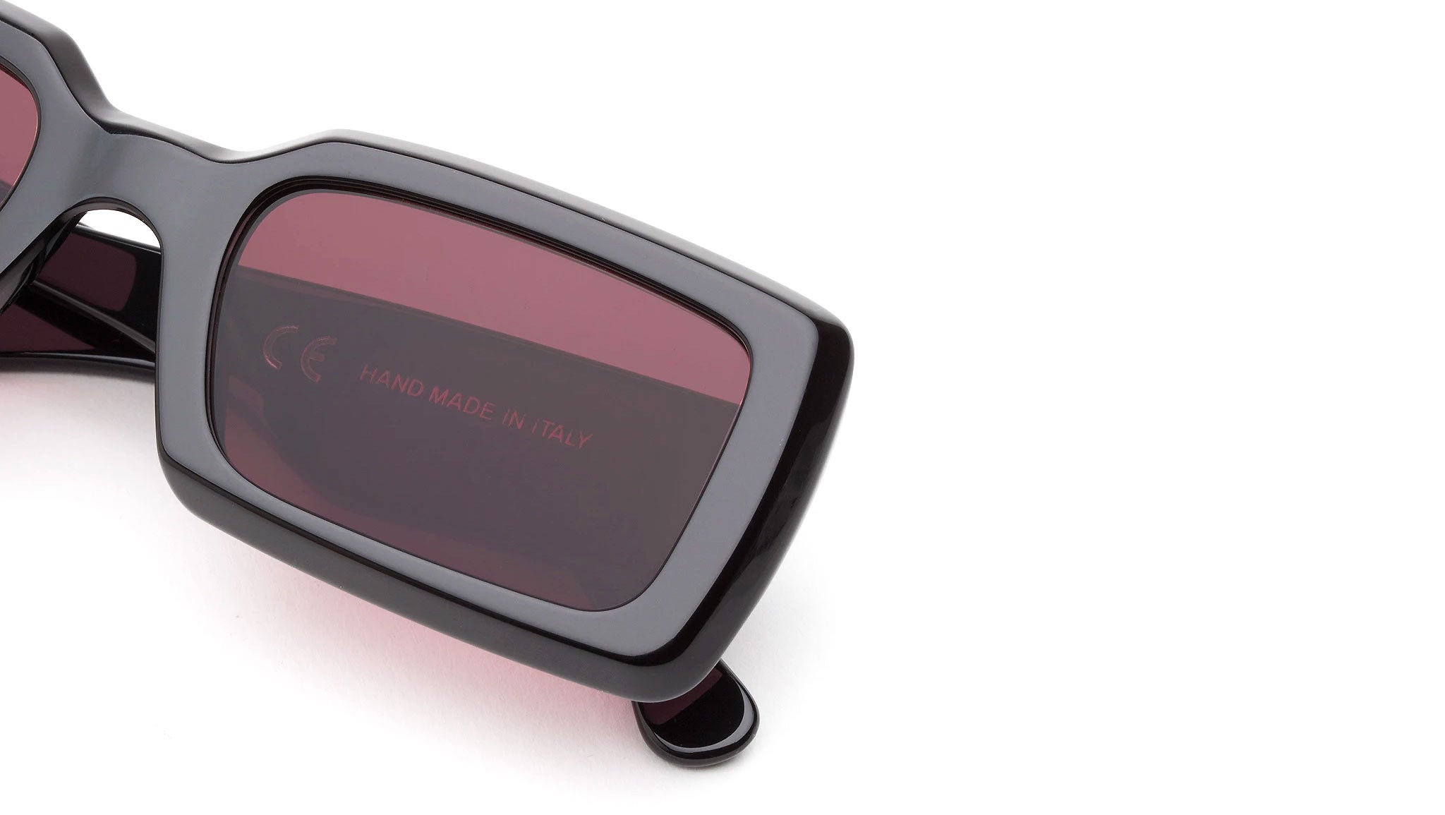 Sacro blends vintage references with cutting-edge modern design. The silhouette is characterized by a rectangular oversized shape with squared lenses and chiseled edges on its thick moulded rims. Sacro comes with a shiny black acetate and burgundy lenses.