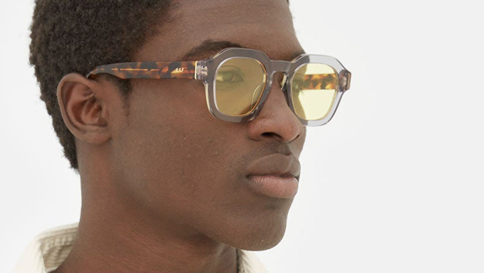 Saluto is a sleek silhouette that underlines the understanding of timeless style: both familiar and essential, yet keeping it fresh and contemporary, this model is conceived as a true instant classic. A more sophisticated version of well-known rounded, fitted shapes, Saluto features a hexagonal design with a raised brow line for a slightly oversized fit. A bold yet unobtrusive icon for the 21st century, Saluto comes in a crystal grey frame, Havana temples and yellow-tinted lenses.