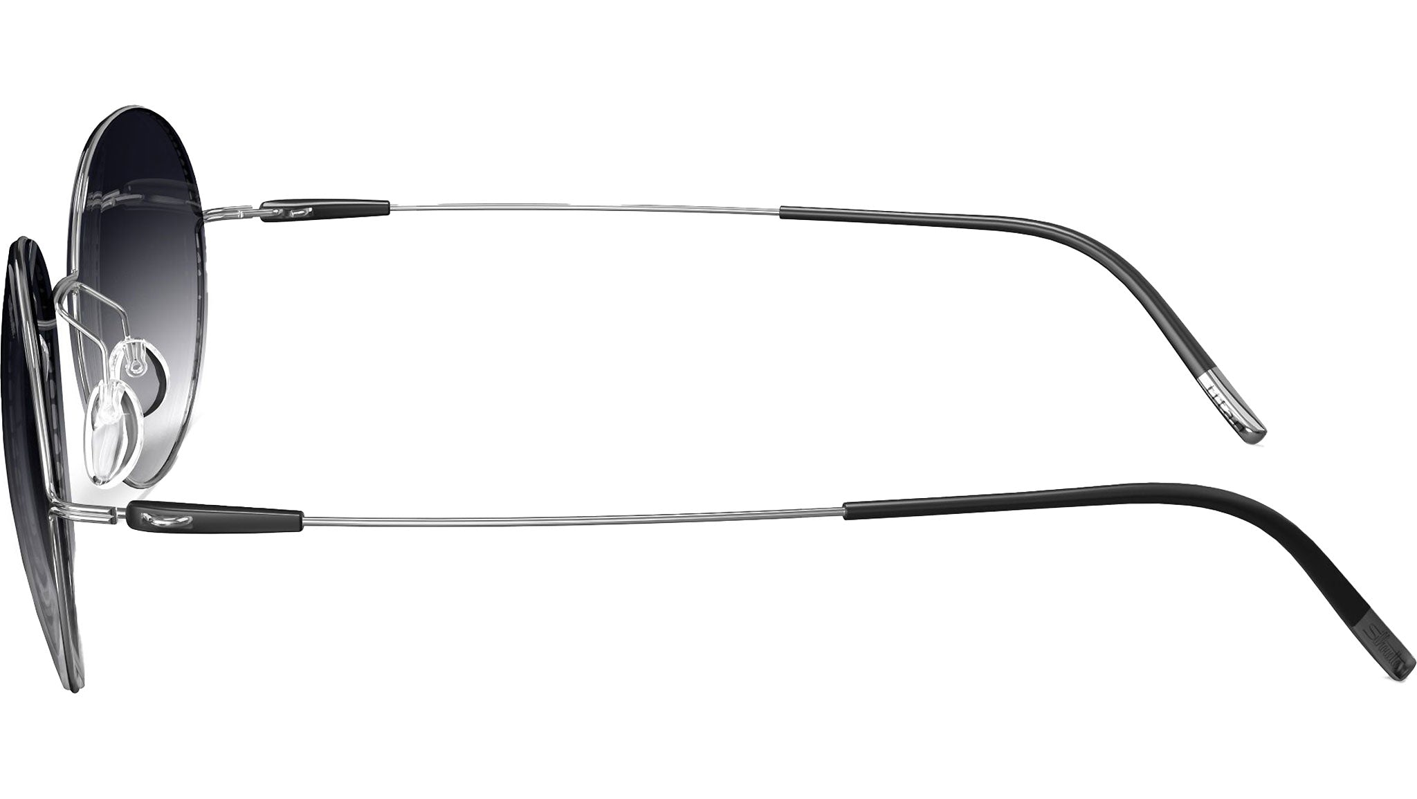 Silhouette Titan Breeze Collection 8736 in 7100 frame color featuring classic grey gradient lenses. The Sant Pere model from the Titan Breeze Collection offers ultimate comfort and quality, with screwless and hypoallergenic features and curvature of base 6. Its lenses are incorporated with the innovative Silhouette Light Management® technology, providing polarization and are made from high-impact polycarbonate. These features assure 100% protection against UV A, B, and C rays, including UV 400, and also have an anti-reflective coating on the backside. The frame, crafted from high-tech titanium, boasts a gold color (7530 Gold) paired with SLM POL Grey lenses. With its 12 perfectly aligned layers, the polarising filter ensures a clear view devoid of undesirable reflections, offering complete visual comfort. The Silhouette Light Management® technology further amplifies UV protection, anti-glare protection, and color enhancement. This technology is available in classic sunglasses colors such as grey, brown, and green.